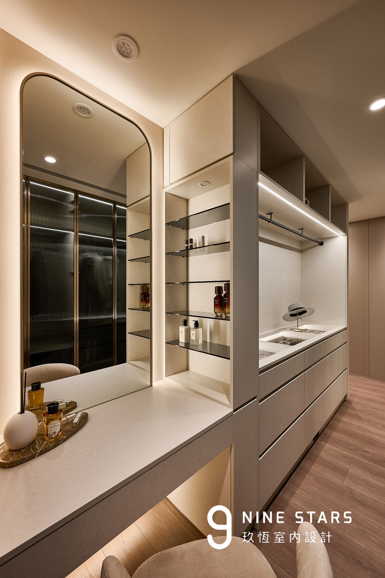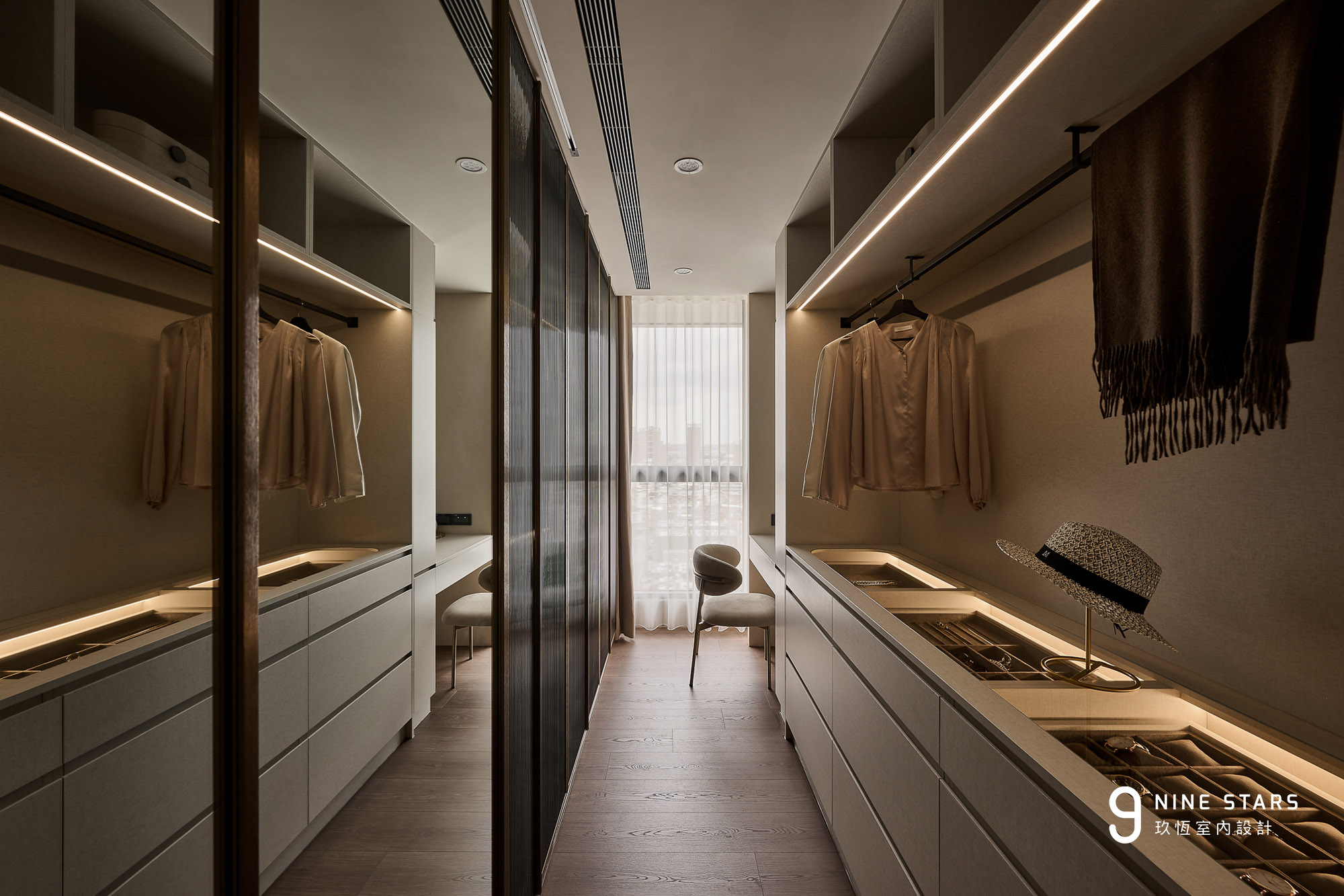雙排衣櫃讓功能清晰、收納充足,而鏡面、抽屜、吊掛與層板的細緻搭配,也讓更衣日常變得更優雅而從容。