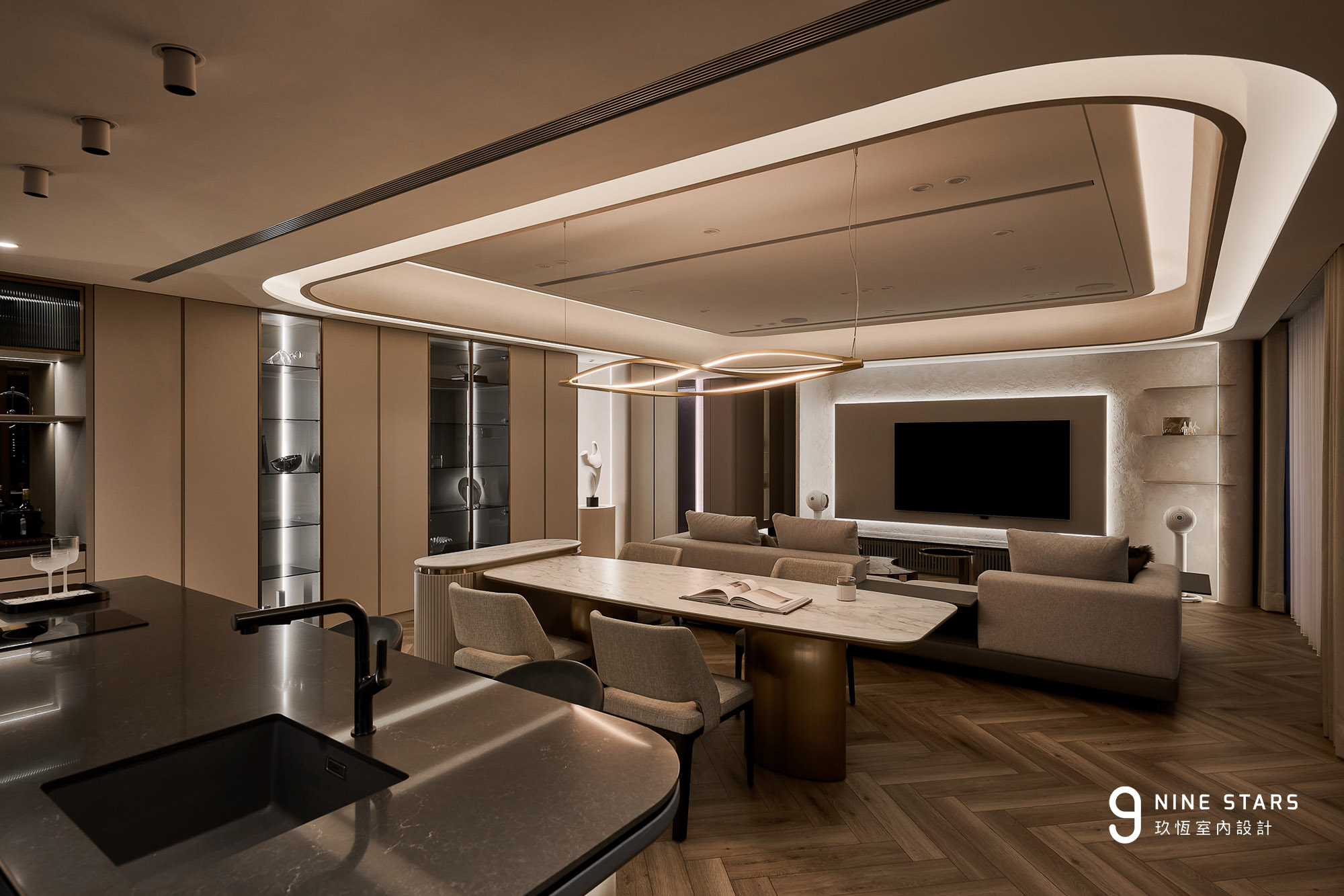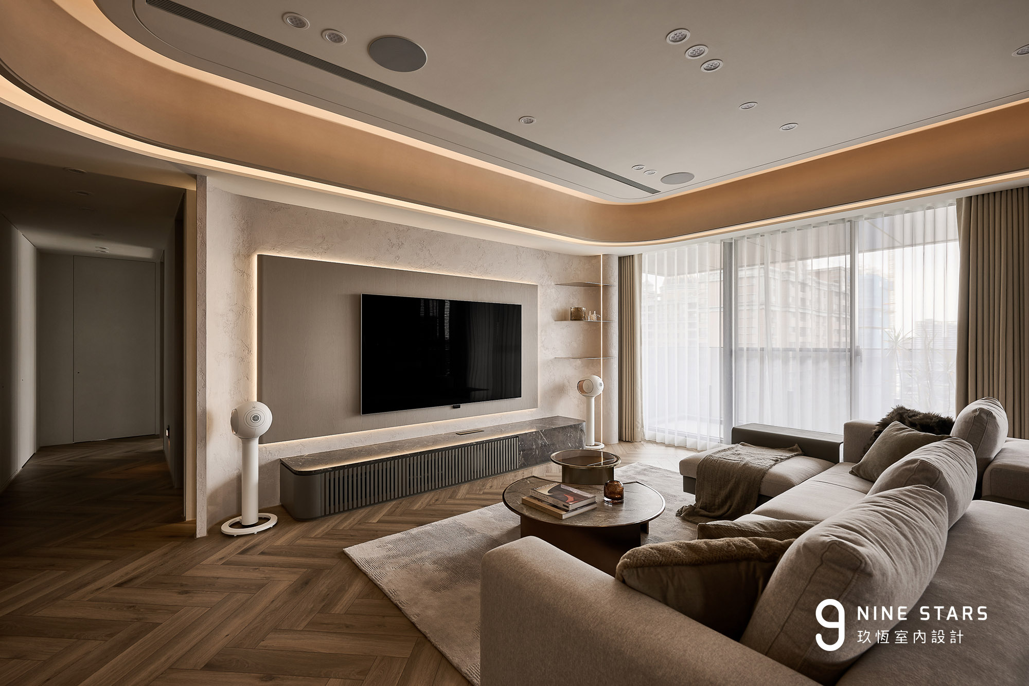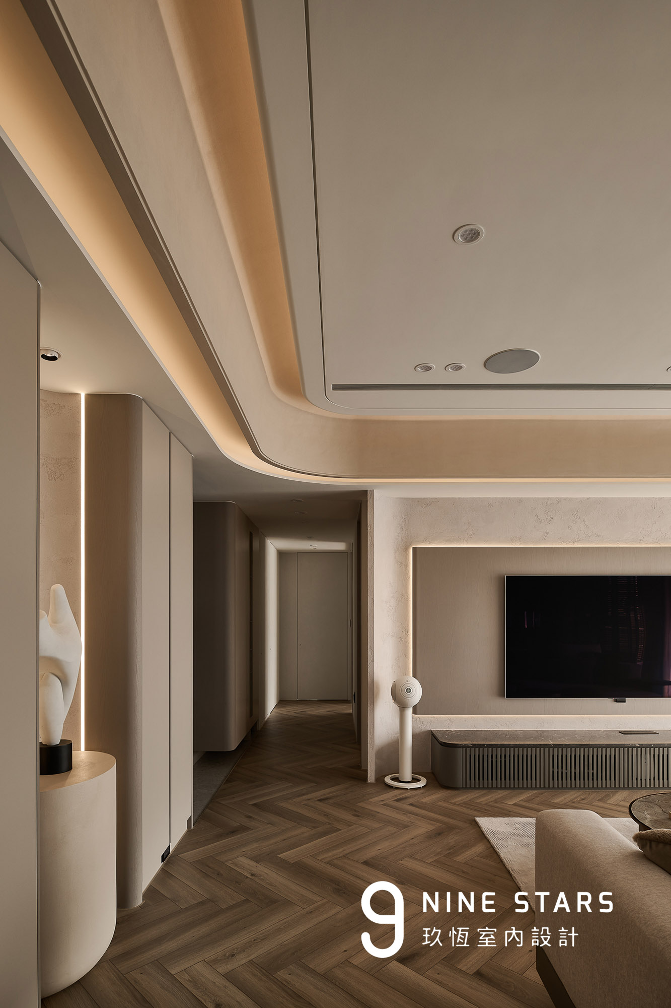 真正的質感不靠昂貴材料堆砌,而在於比例、材質與光線的協調。從玄關弧形天花的精準比例,到客廳燈帶避免外溢的角度,甚至音響線材的前期預埋,每一處細節都為了讓空間更順、更乾淨、更耐看。