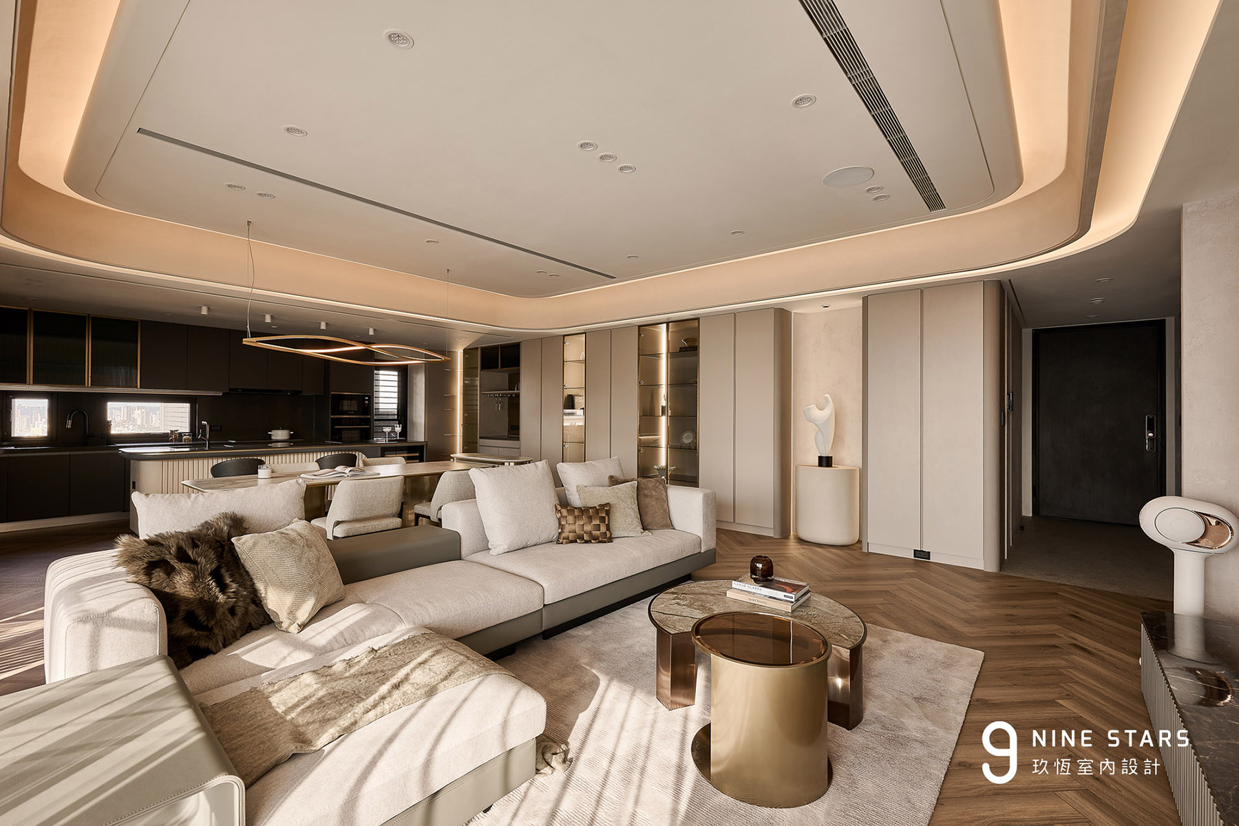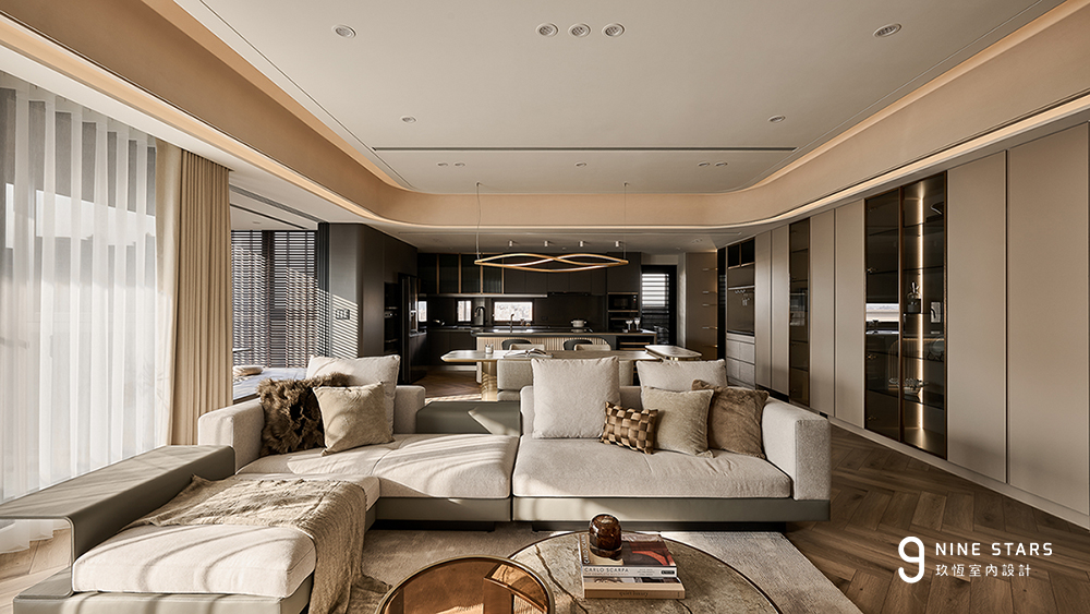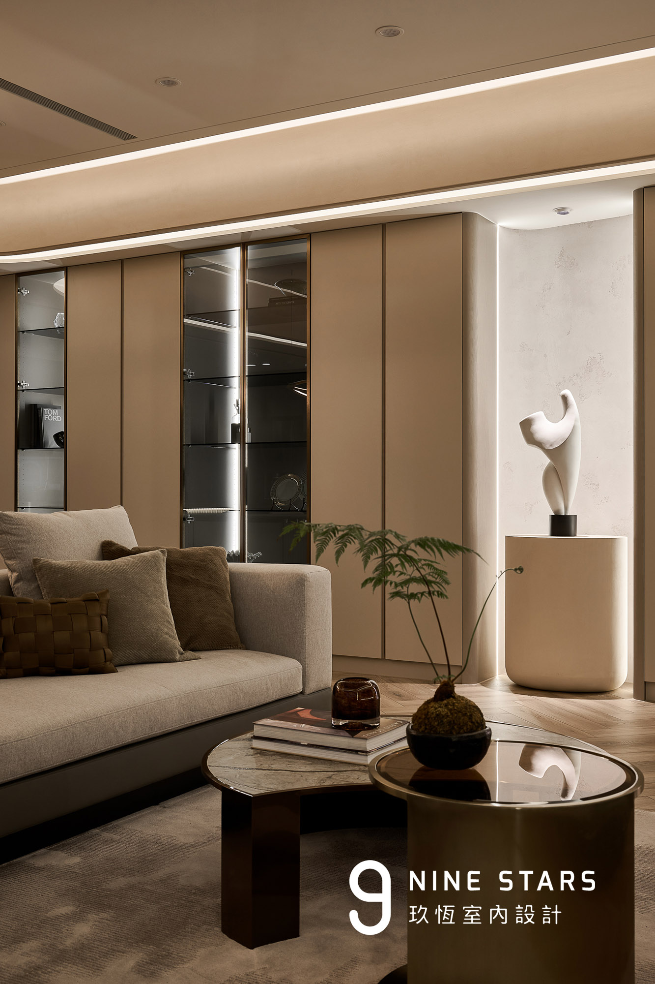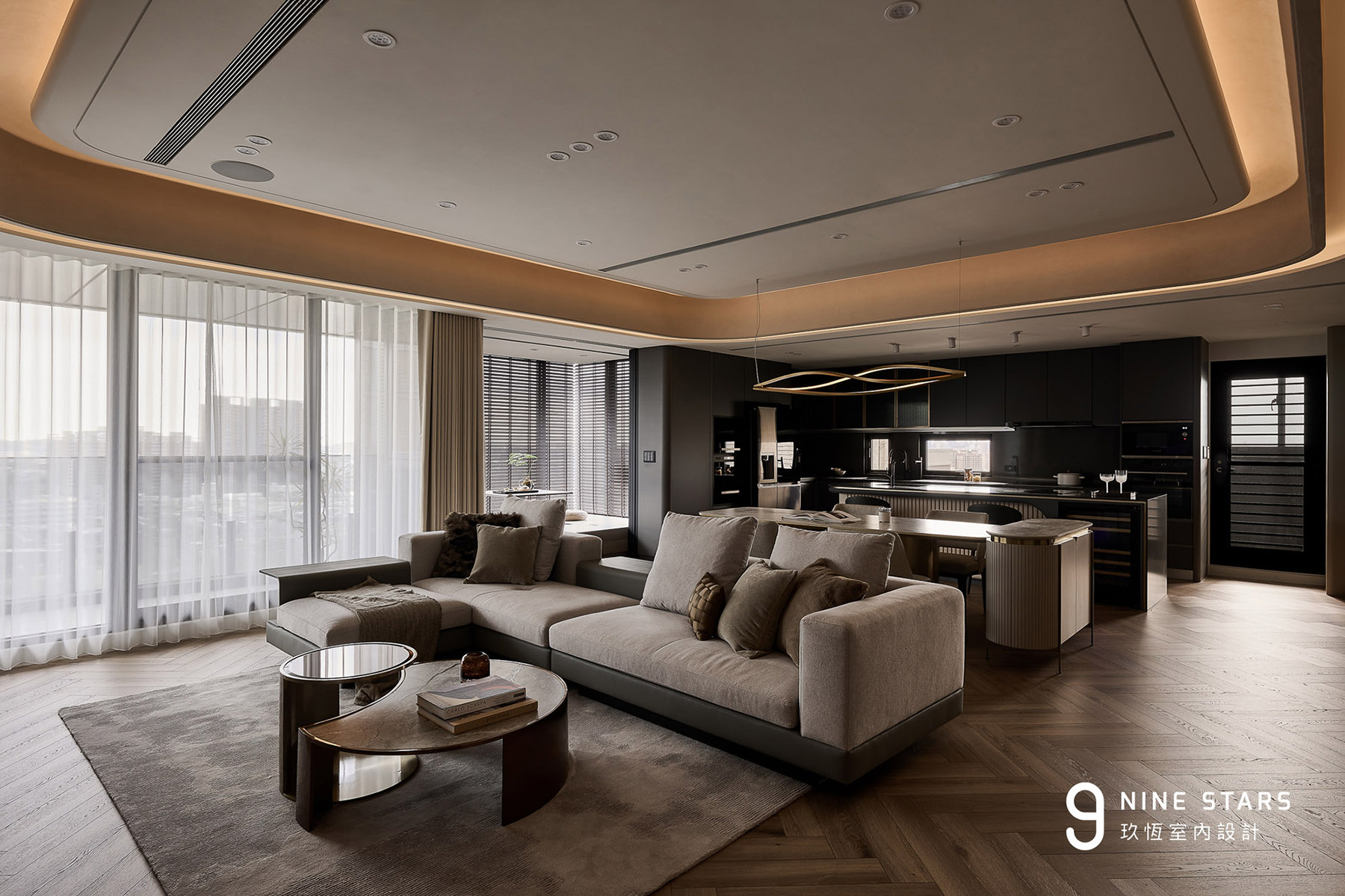 真正的質感不靠昂貴材料堆砌,而在於比例、材質與光線的協調。從玄關弧形天花的精準比例,到客廳燈帶避免外溢的角度,甚至音響線材的前期預埋,每一處細節都為了讓空間更順、更乾淨、更耐看。