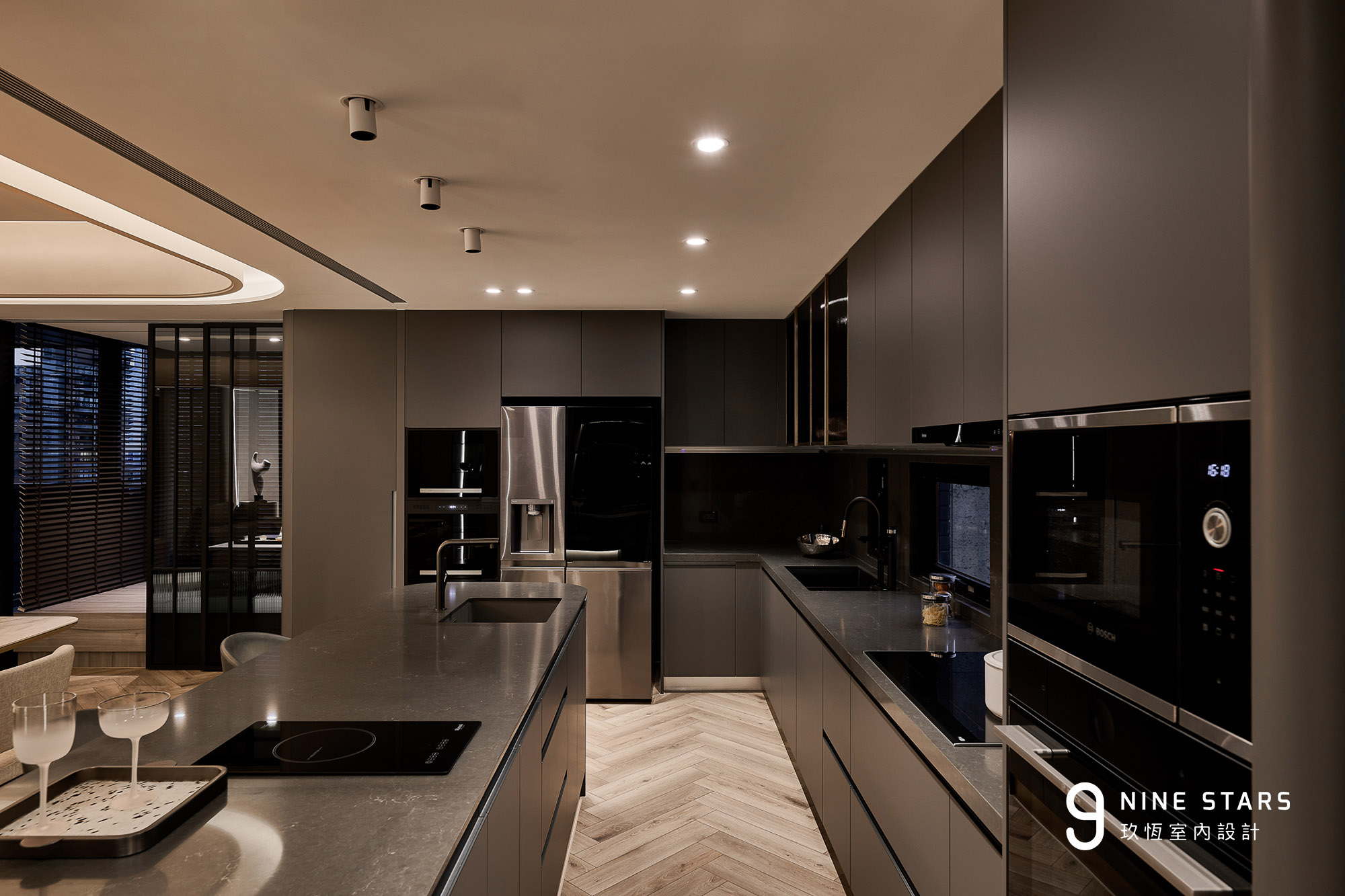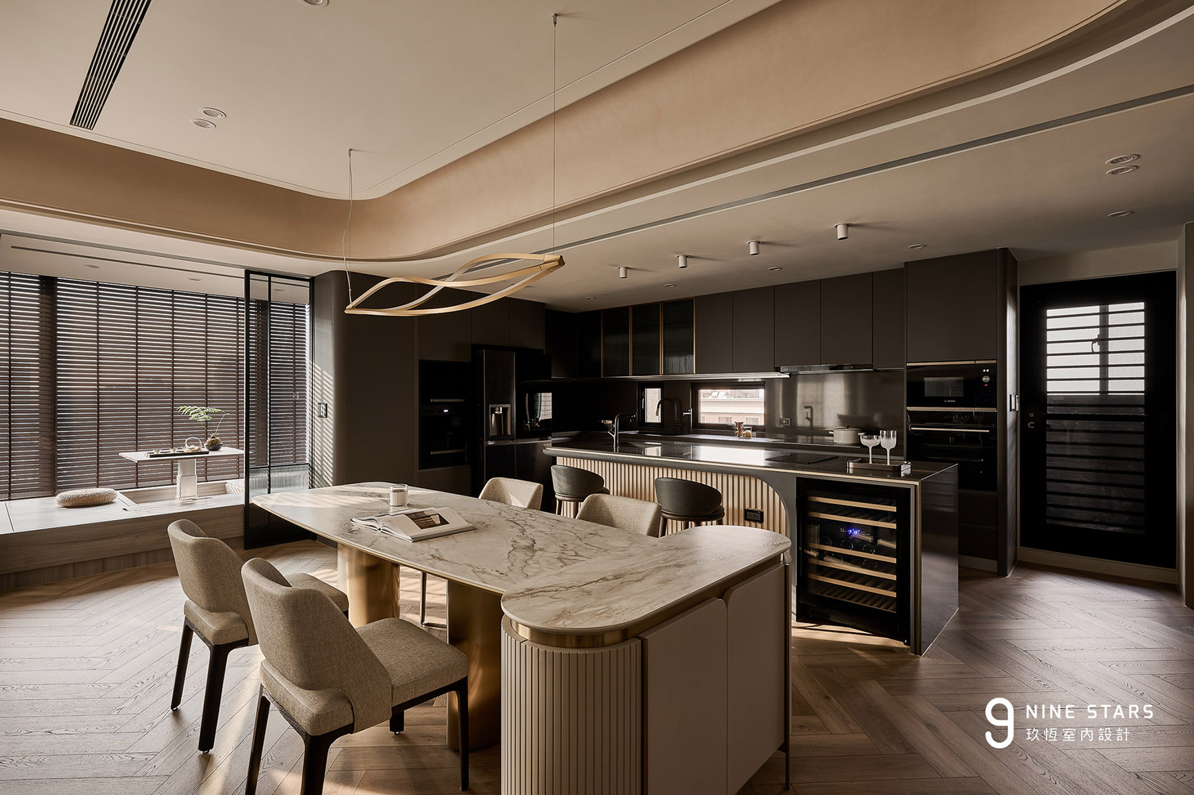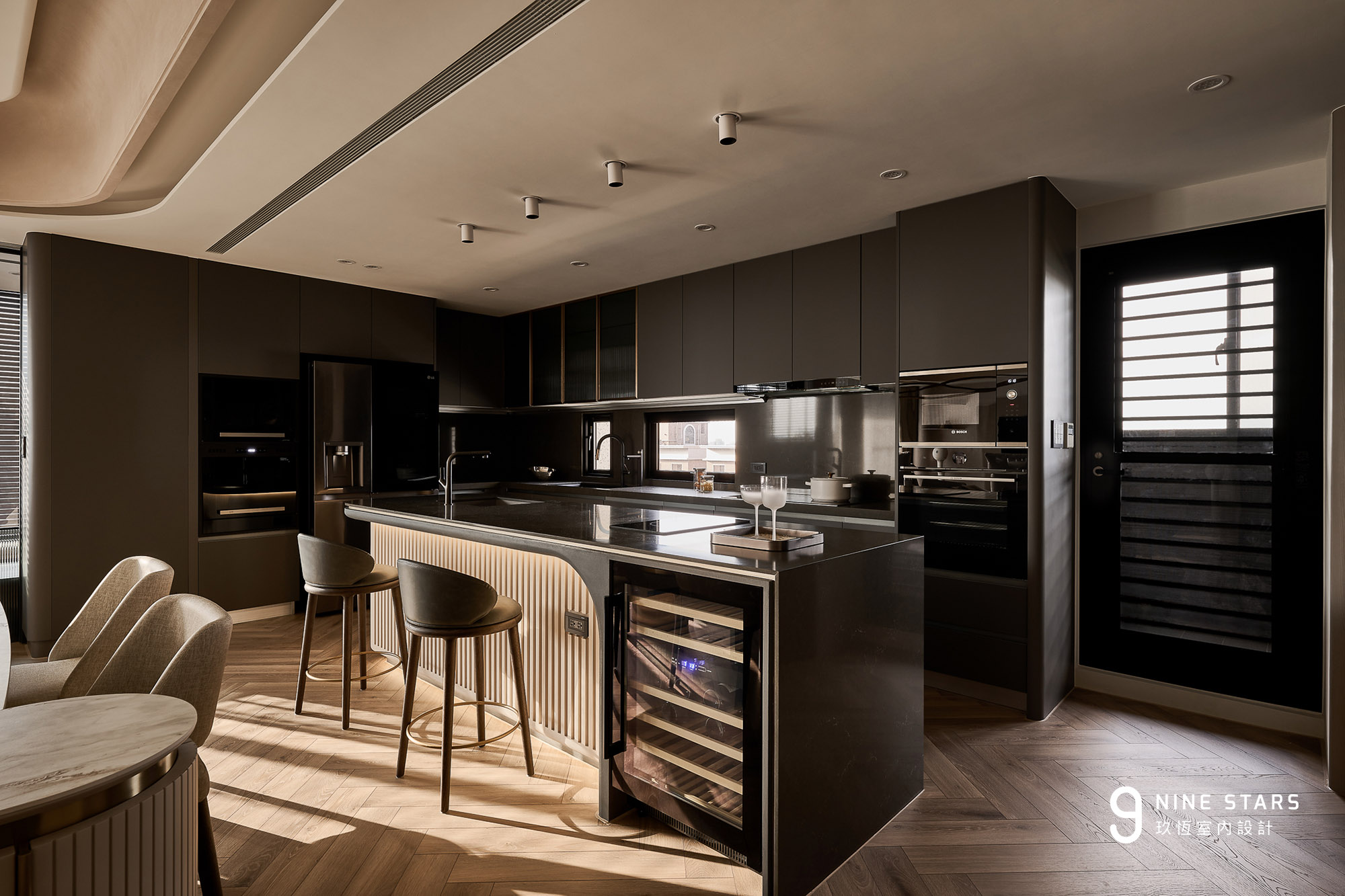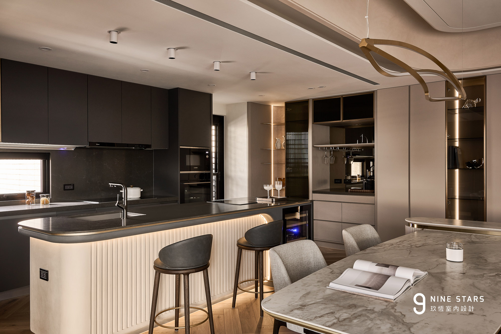 廚房雖以機能為先,中島卻不僅作為料理檯面,更被賦予成為視線焦點的角色。然而中島量體本身較大,若僅以單一處理,很容易顯得笨重、突兀。因此在豪宅裝潢設計上,建材的進出面巧思融入了層層細緻的刻畫——透過比例、材質與細節的推敲,讓這個機能空間擁有了「一眼便被吸引」的質地與色彩。