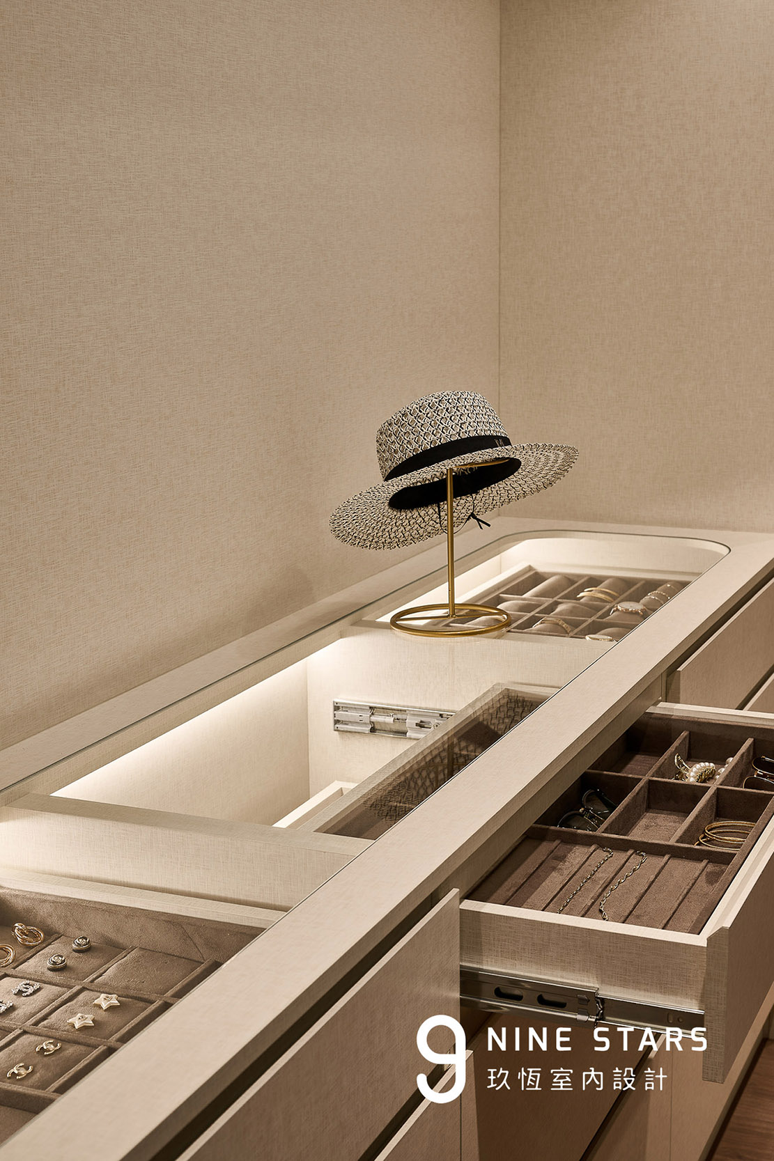 此外,設計團隊根據豪宅屋主實際擁有的飾品數量、類型,設計客製化飾品盤:將手錶、飾品分格,精確讓未來使用上有專屬的精品展示平台。
