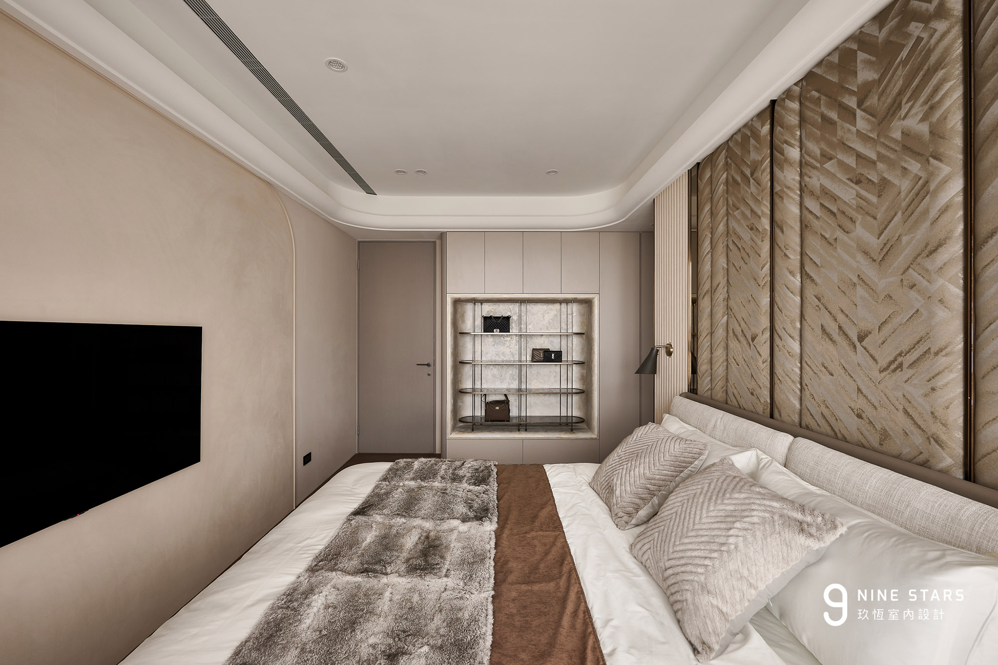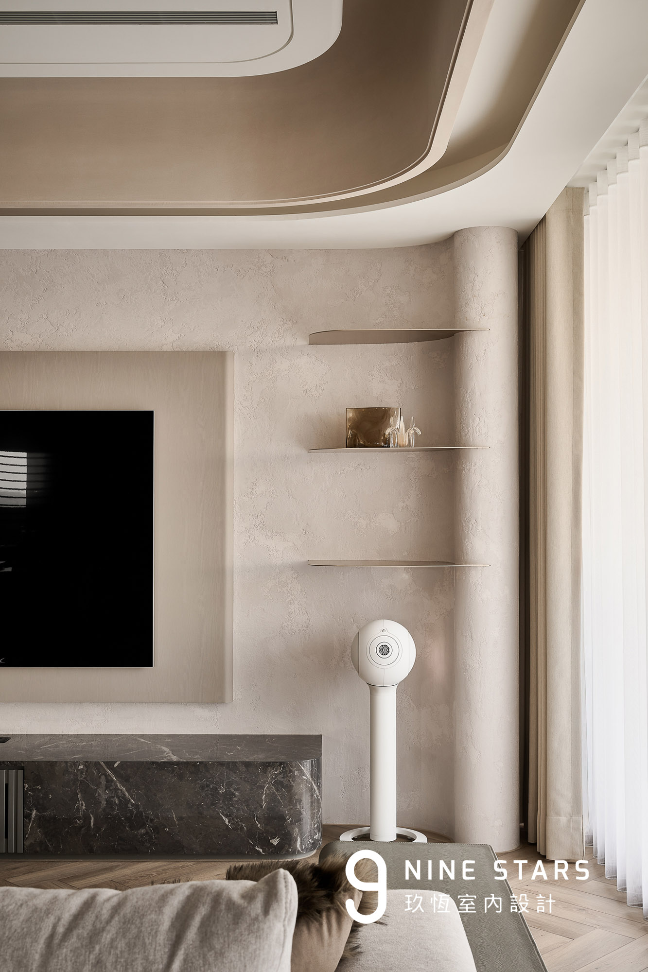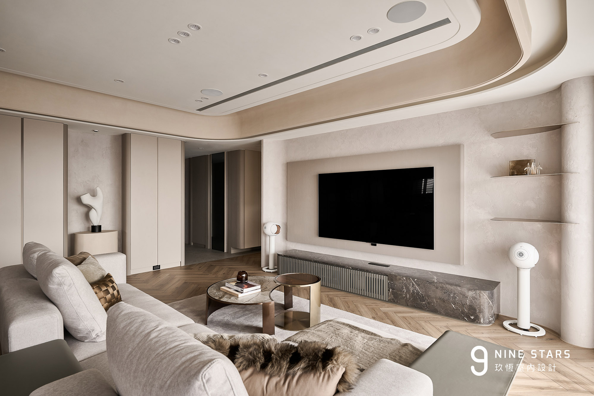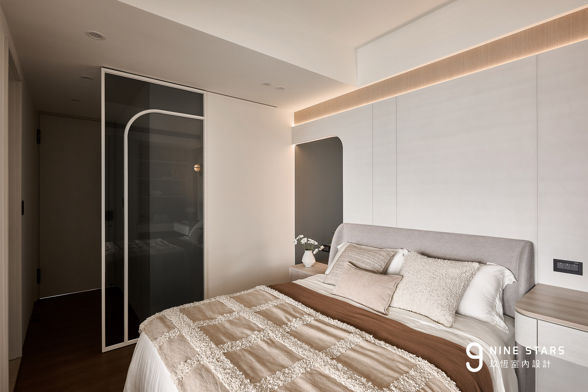 圖:主臥電視牆延續背板設計,以弧形轉角銜接至天花,營造環繞包覆感。