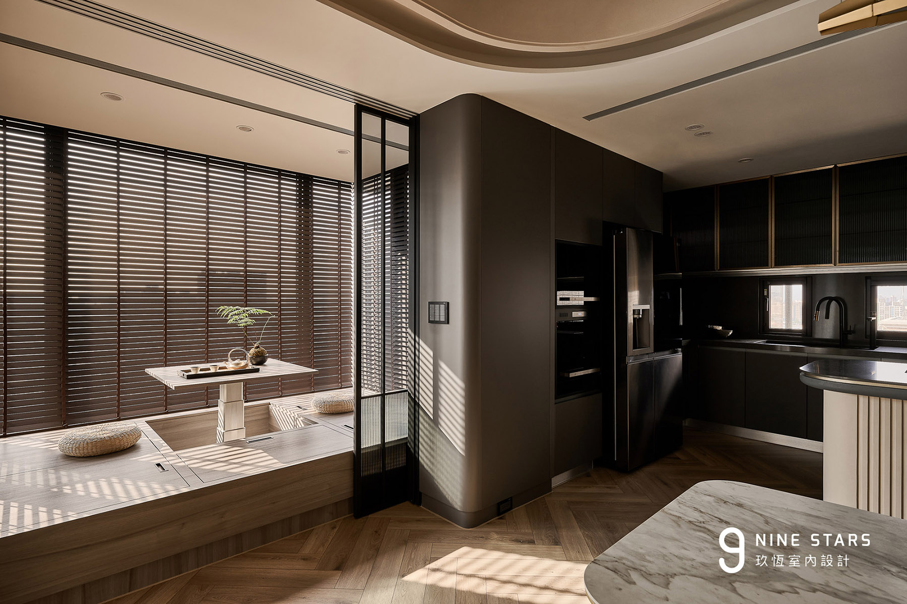 得天獨厚絕佳的高樓層位置,緊鄰中島,有一間擁有三面採光的和室。白天光線柔柔落下,夜裡寧靜沉穩,可遠視眺望的景觀位置,即便一整天待在家,透過獨立空間的規劃,也能瞬間轉換心情。