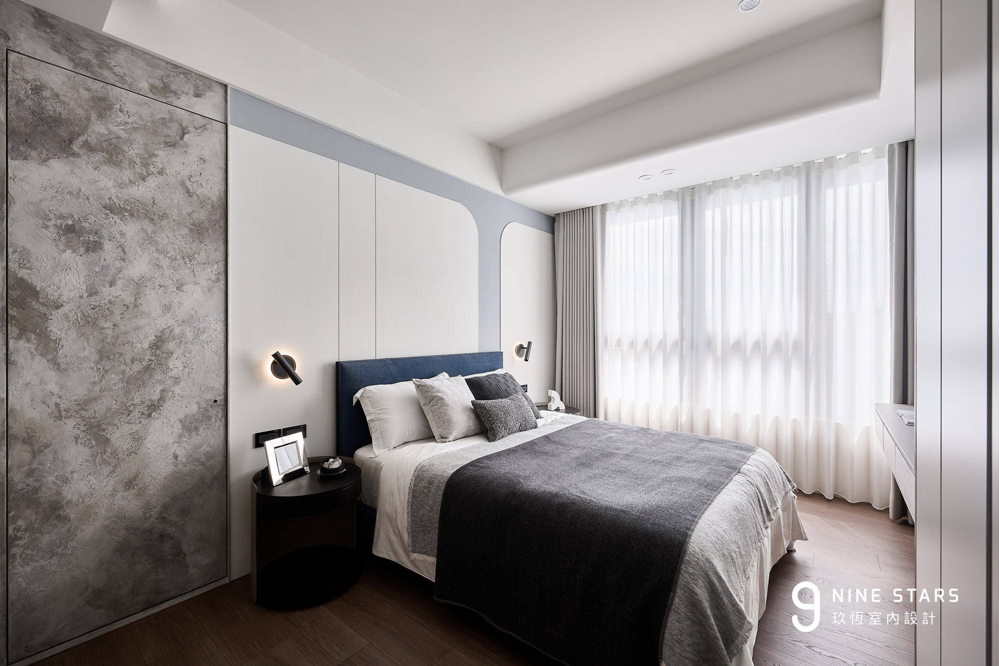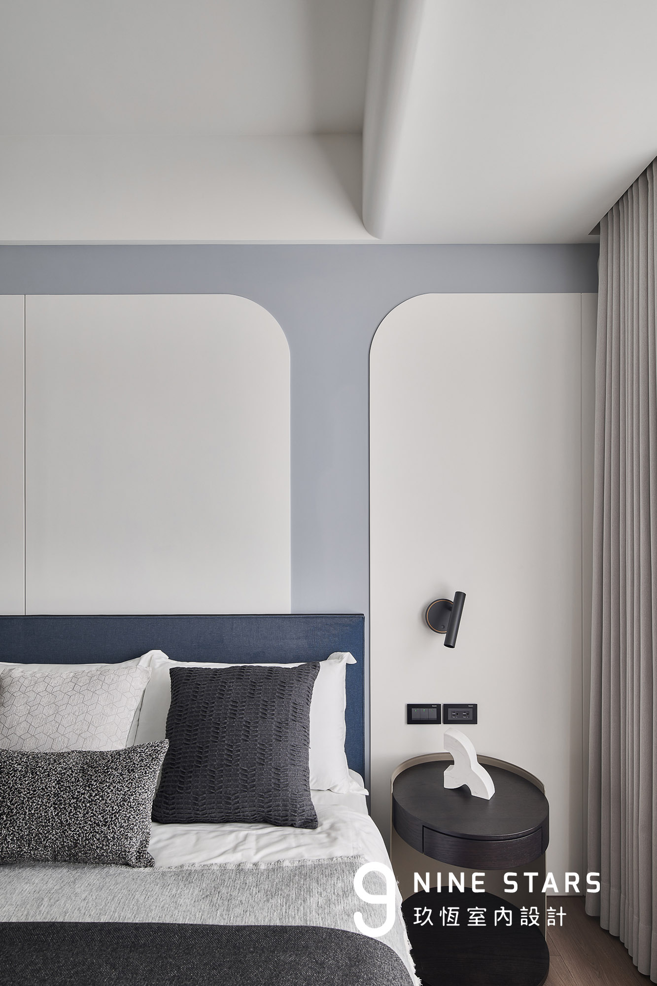 床頭兩側以對稱的圓角床頭櫃與壁燈輕輕收束,造型純淨、線條柔和,與整體空間的弧形語彙優雅呼應。