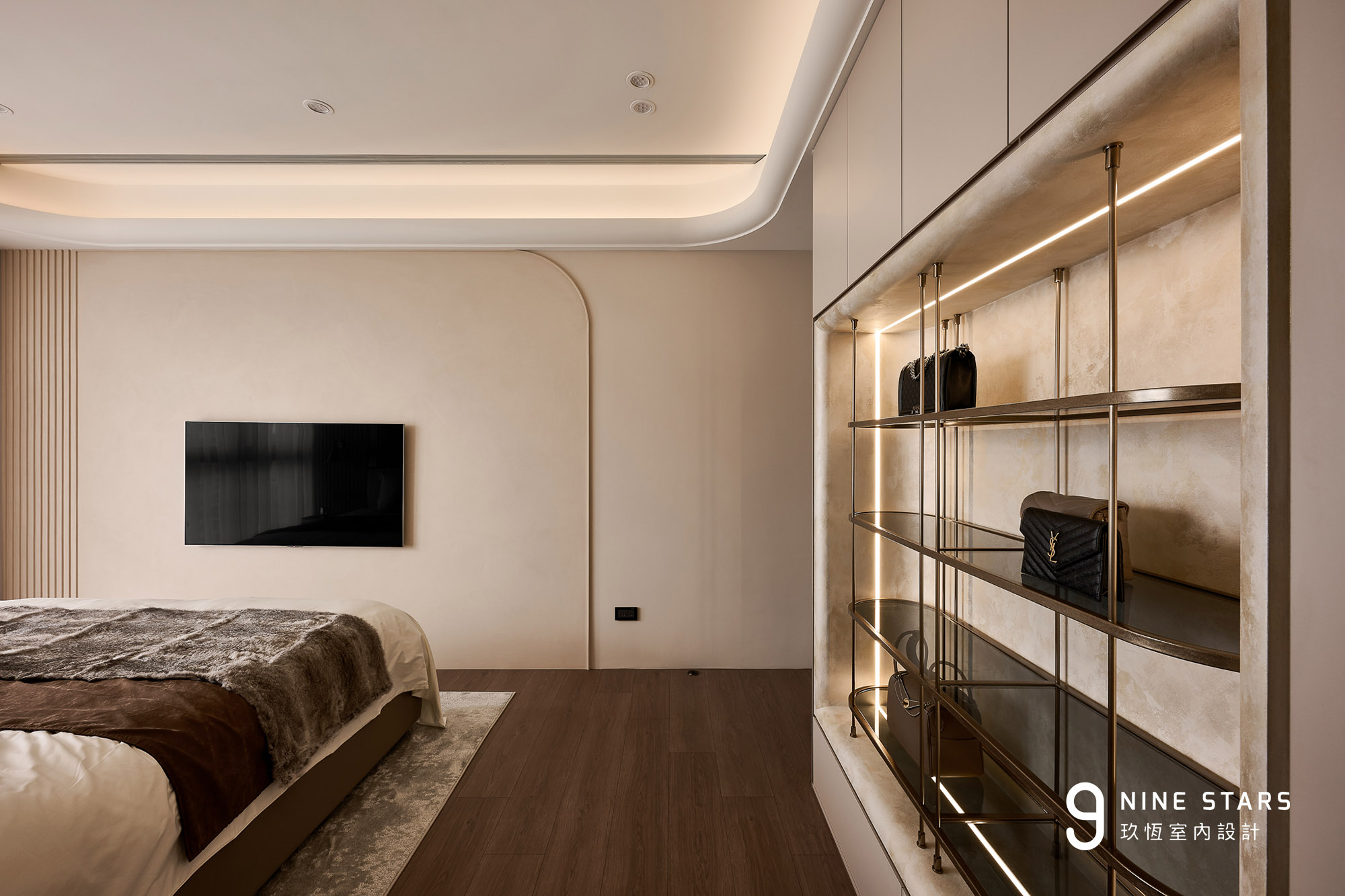 主臥套房,是本案另一重點空間。屋主希望主臥兼具睡眠與更衣展示功能,因此設計師在主臥配置了一張Queen Size雙人床之餘,特別規劃了一區「精品包包展示櫃」緊鄰更衣空間。