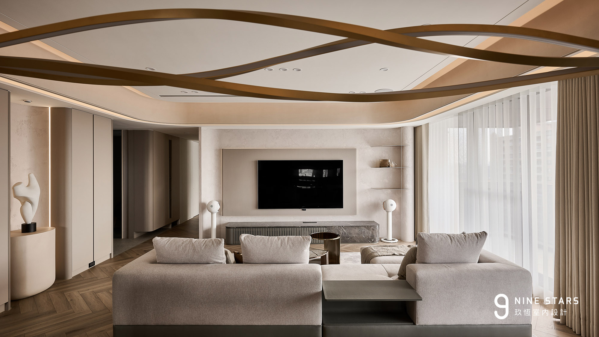 「弧形」是我們很早就確立的核心語彙。屋主一家有四位活力十足的孩子,而幼齡孩子成長階段奔跑、轉身、追逐,是生活裡最自然的日常。因此,設計團隊希望豪宅裝潢空間不僅如風般柔和、流動,也能在無聲處,為孩子築起安全的弧線。