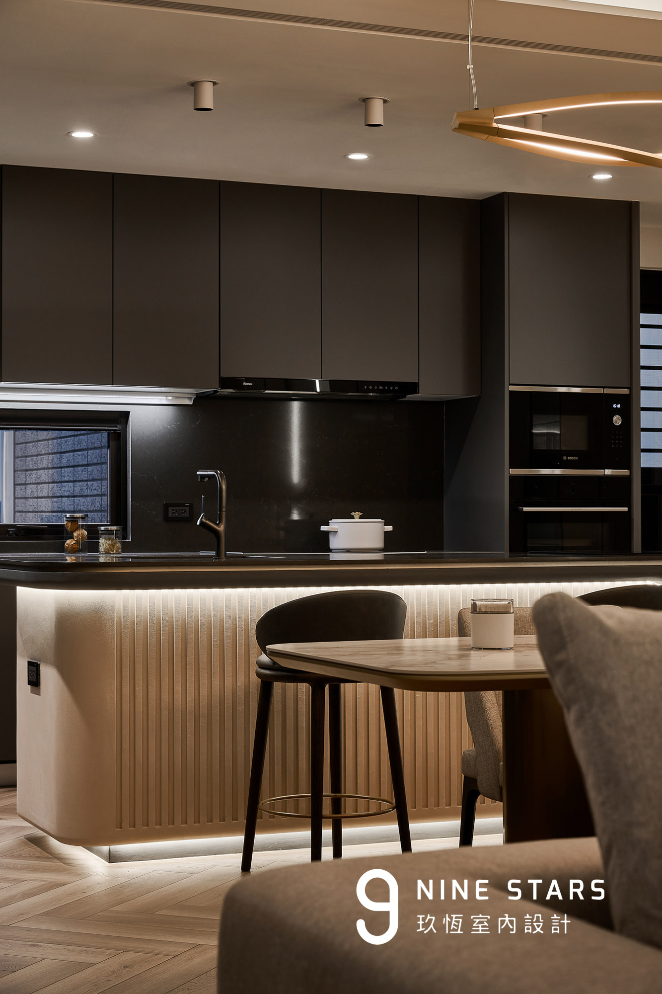 與此同時,電視牆一路延展至餐廳與中島,皆採用深色石紋作為視覺軸線,穩住空間的重心,讓視覺自然沉澱。就像穿搭裡,深色衣著若配上一雙過亮的鞋,比例便會失衡、顯得頭重腳輕;色彩在空間中的協調,同樣決定了整體的平衡、節奏與優雅。