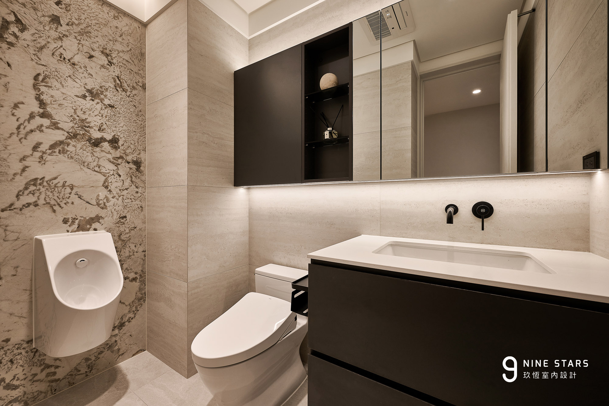 - 客浴因主要接待賓客,主題牆選用大理石質感的大板磚,讓視覺自然延續至公共區域的輕奢氛圍。小便斗前方的大板岩紋磚自地坪延展至天花,宛如靜默石壁,光澤柔和、易於清潔,成為客衛的一道安定景致。