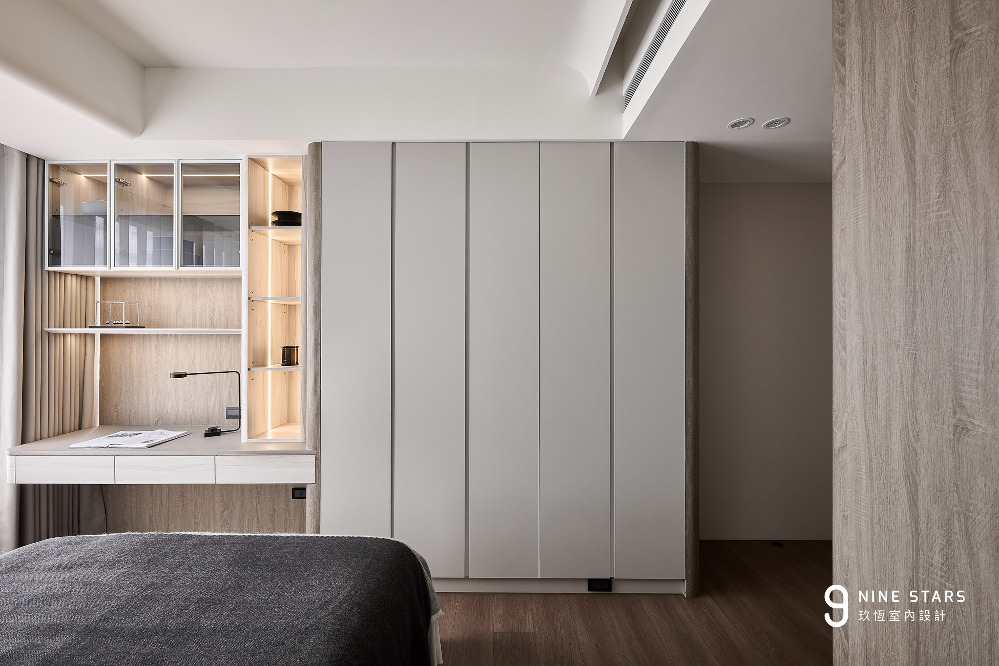 - 以封閉式衣櫃搭配開放吊掛與抽屜,將日常收納分層有序