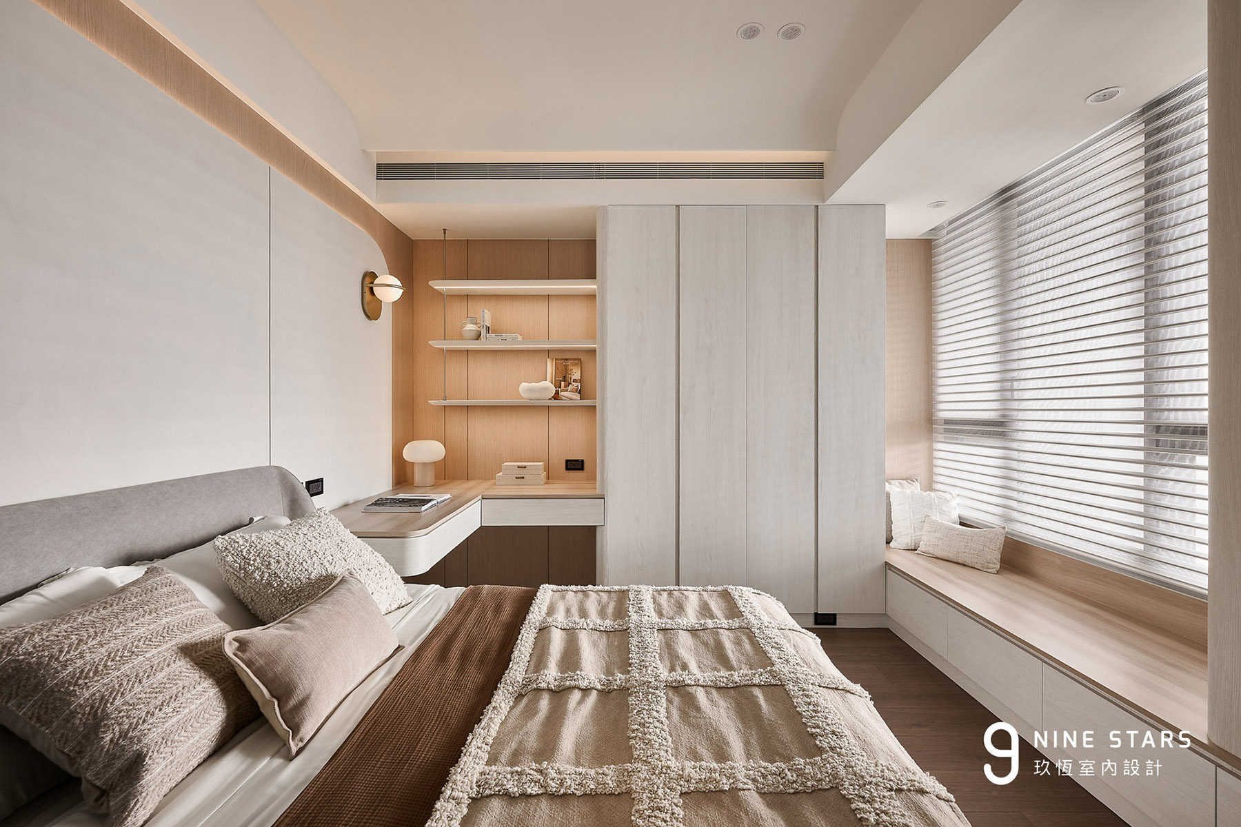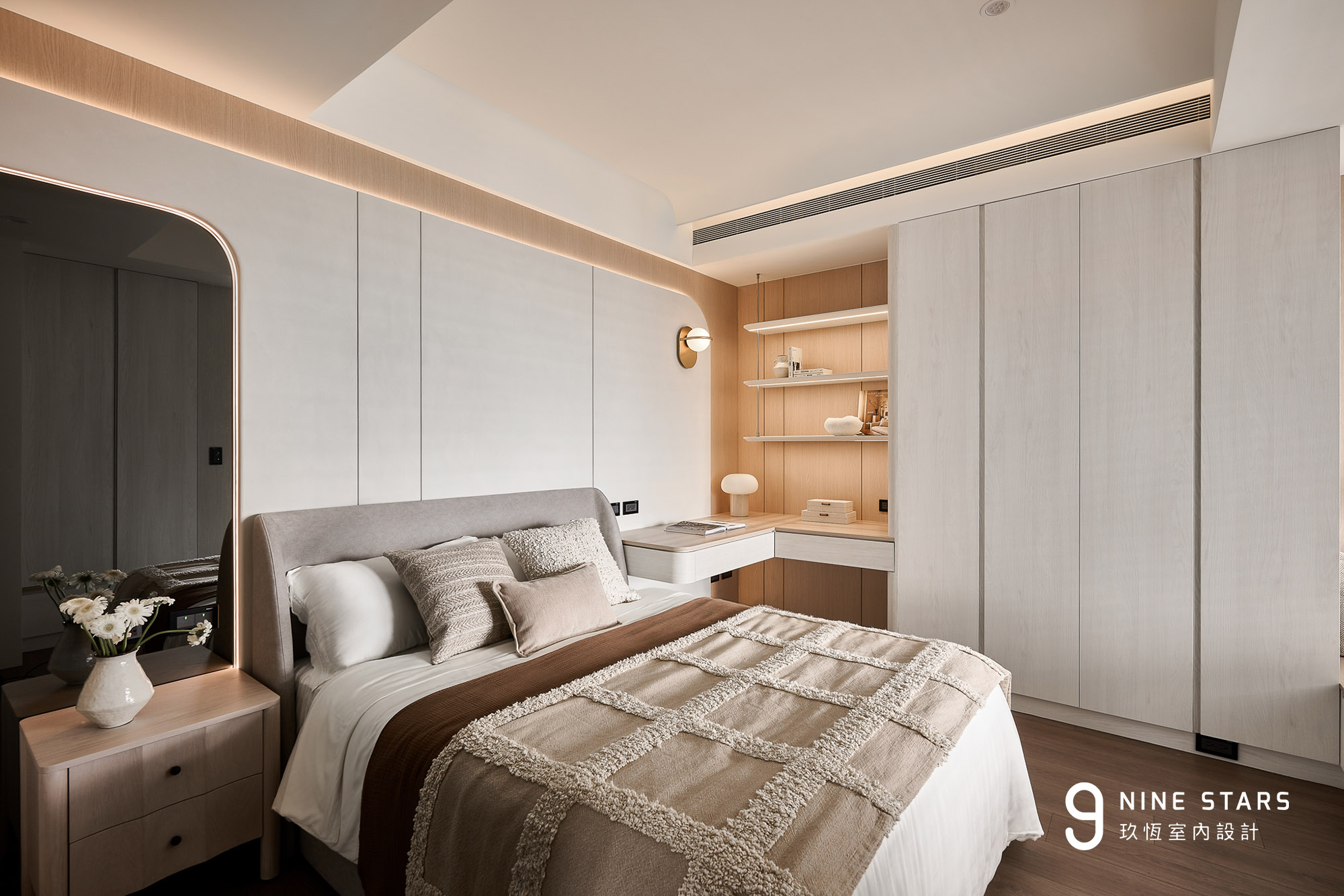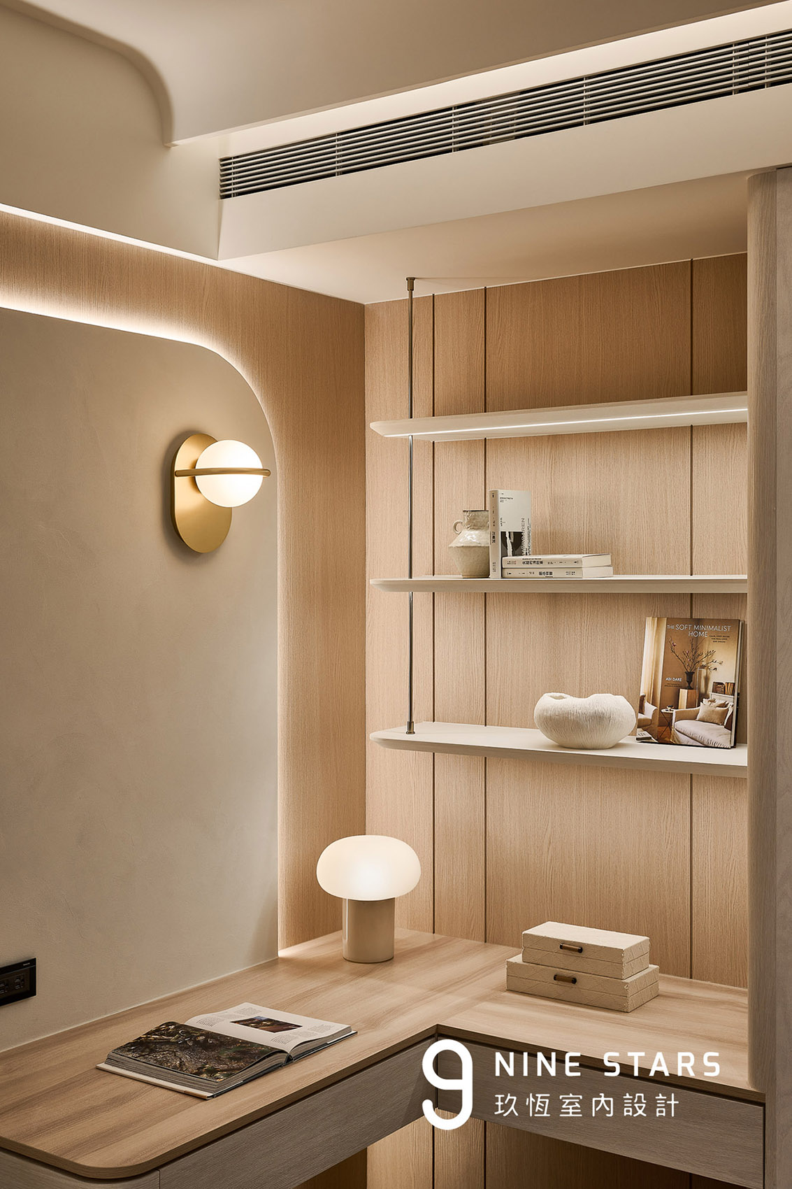 設計團隊延續全屋的主軸,依然以柔和曲線與溫潤色調為基底,但也因應使用者的不同,融入專屬於他的個性細節。考量男孩的個人喜好與成長特質,房間整體色系更為沉穩,以大地色為主調,內斂而安定;然而在材質與色彩語彙上,仍與玄關及公共空間相互呼應,使整體風格一致而有延續性。