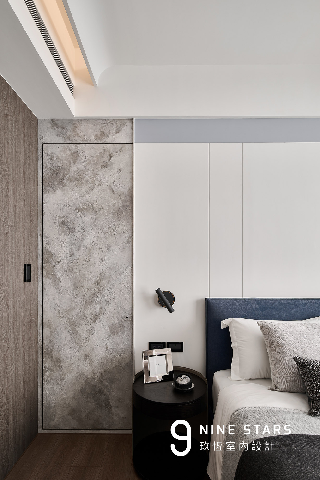 這樣一來既維持了牆面的完整美感,又避免床尾對門的視覺違和,符合居住者心理上的安心。