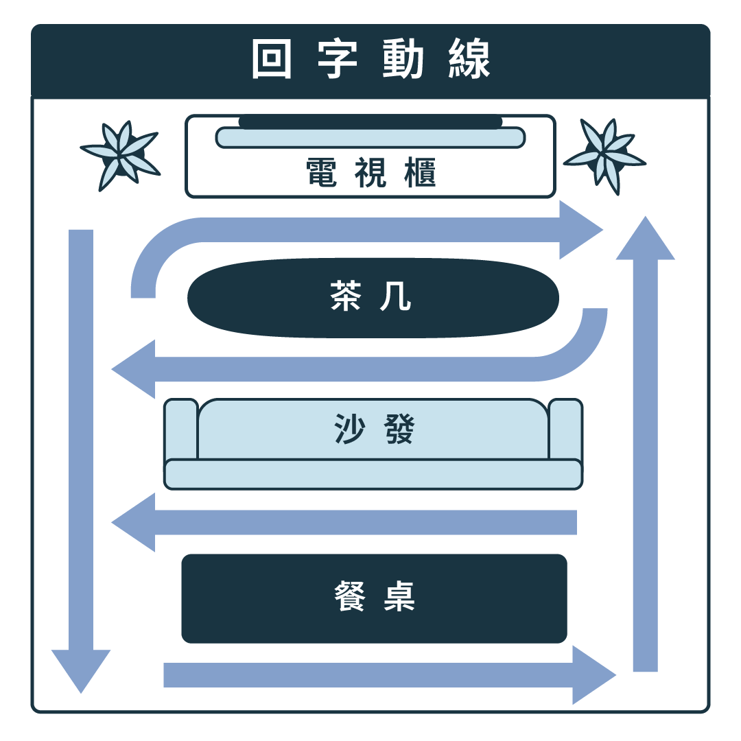 走過廊道右轉,公領域豁然開朗。客廳、餐廳與廚房被設計成一整塊開放空間,並透過回字形動線彼此連接: