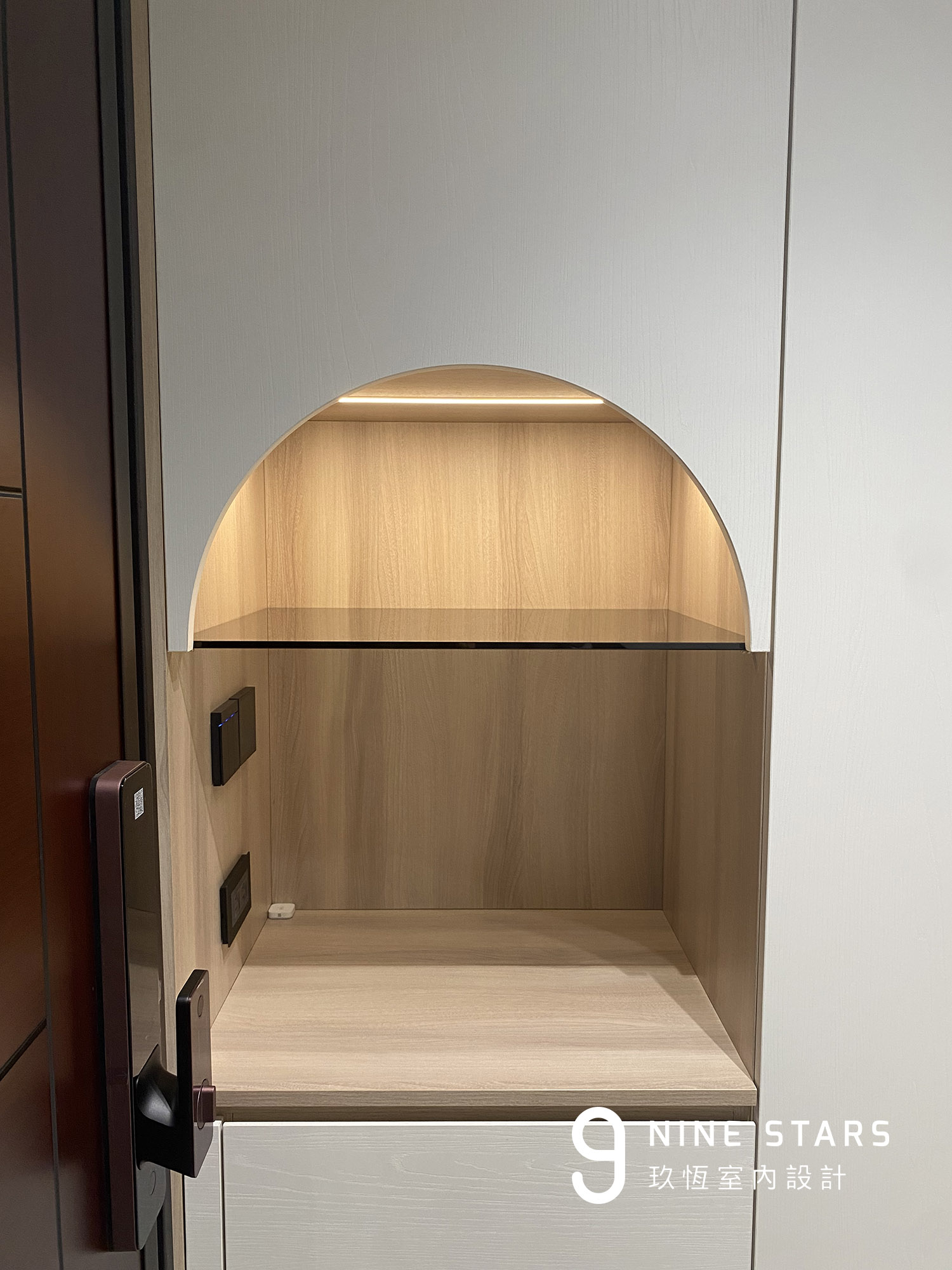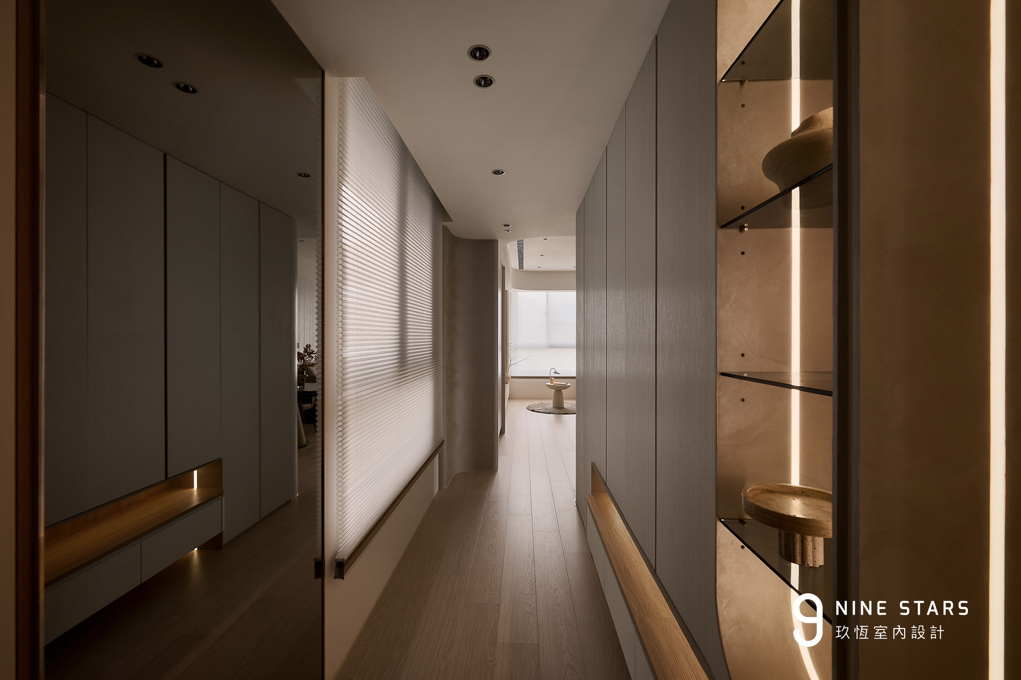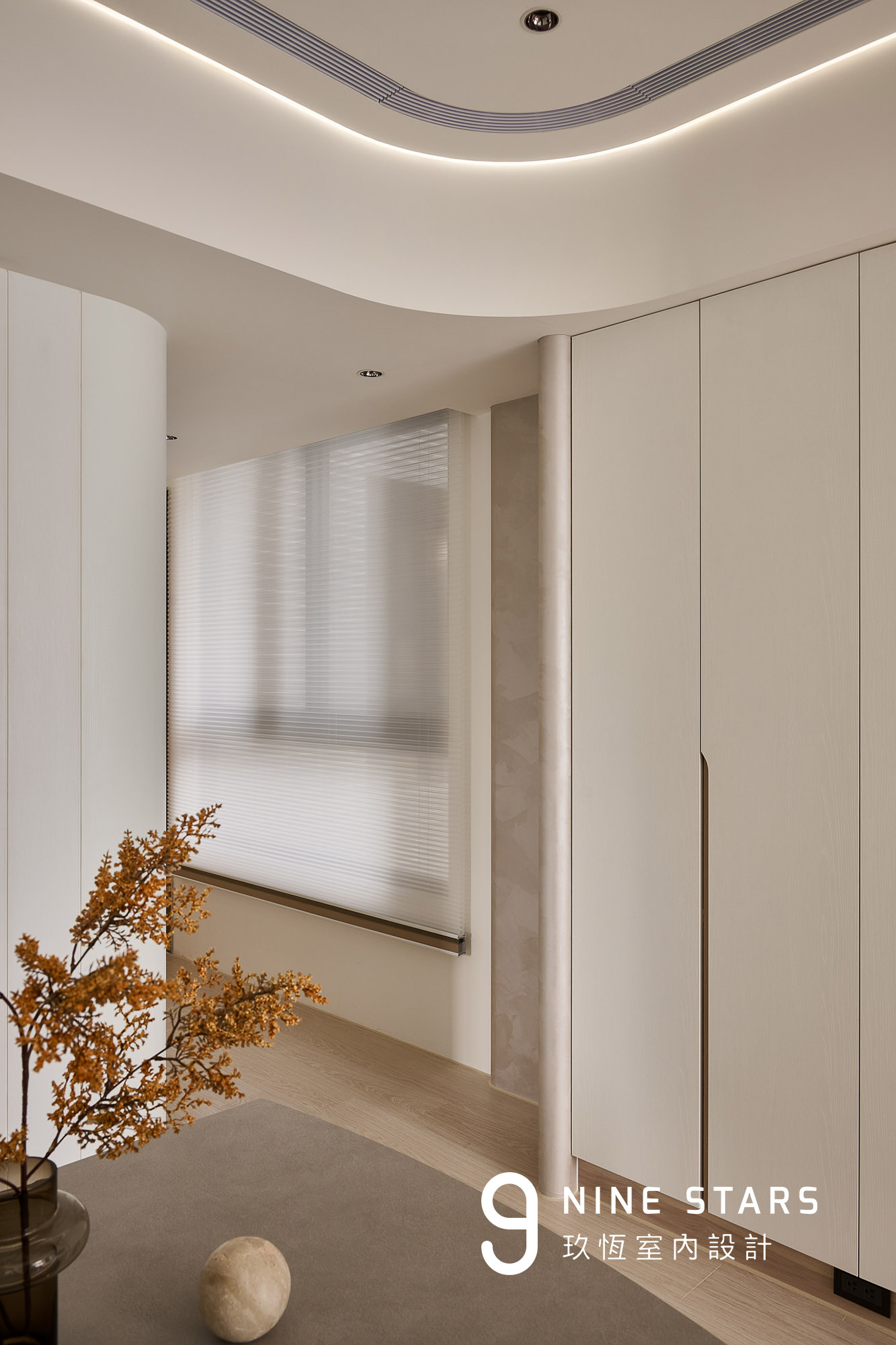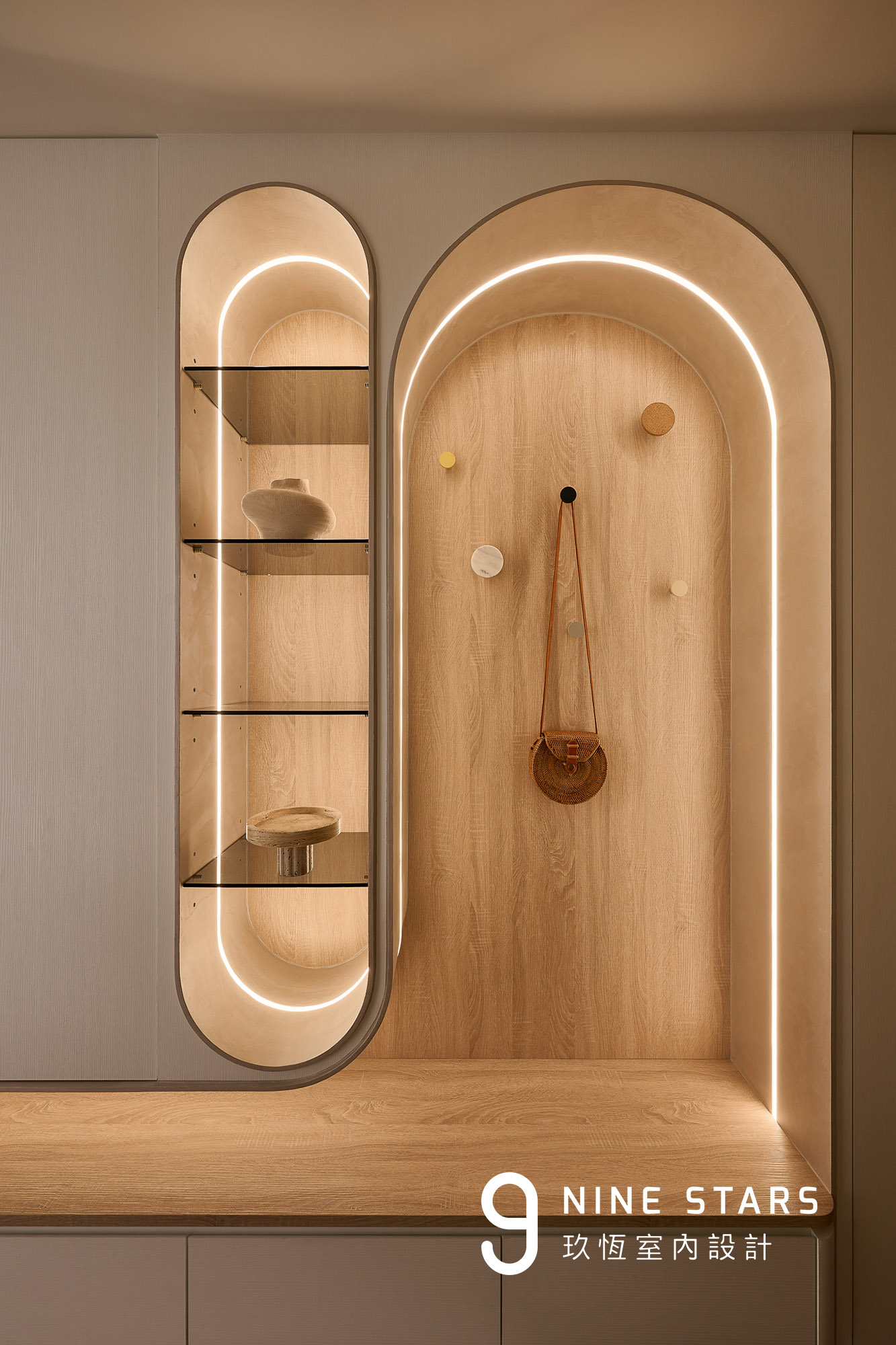 入門視覺以優雅的圓弧造型櫃門揭開序曲,成為全屋弧形設計語彙的起點。櫃內收納鑰匙、備品與日常小物,造型則與斜前方穿鞋椅相互呼應,讓動線與視覺保持柔和連續。