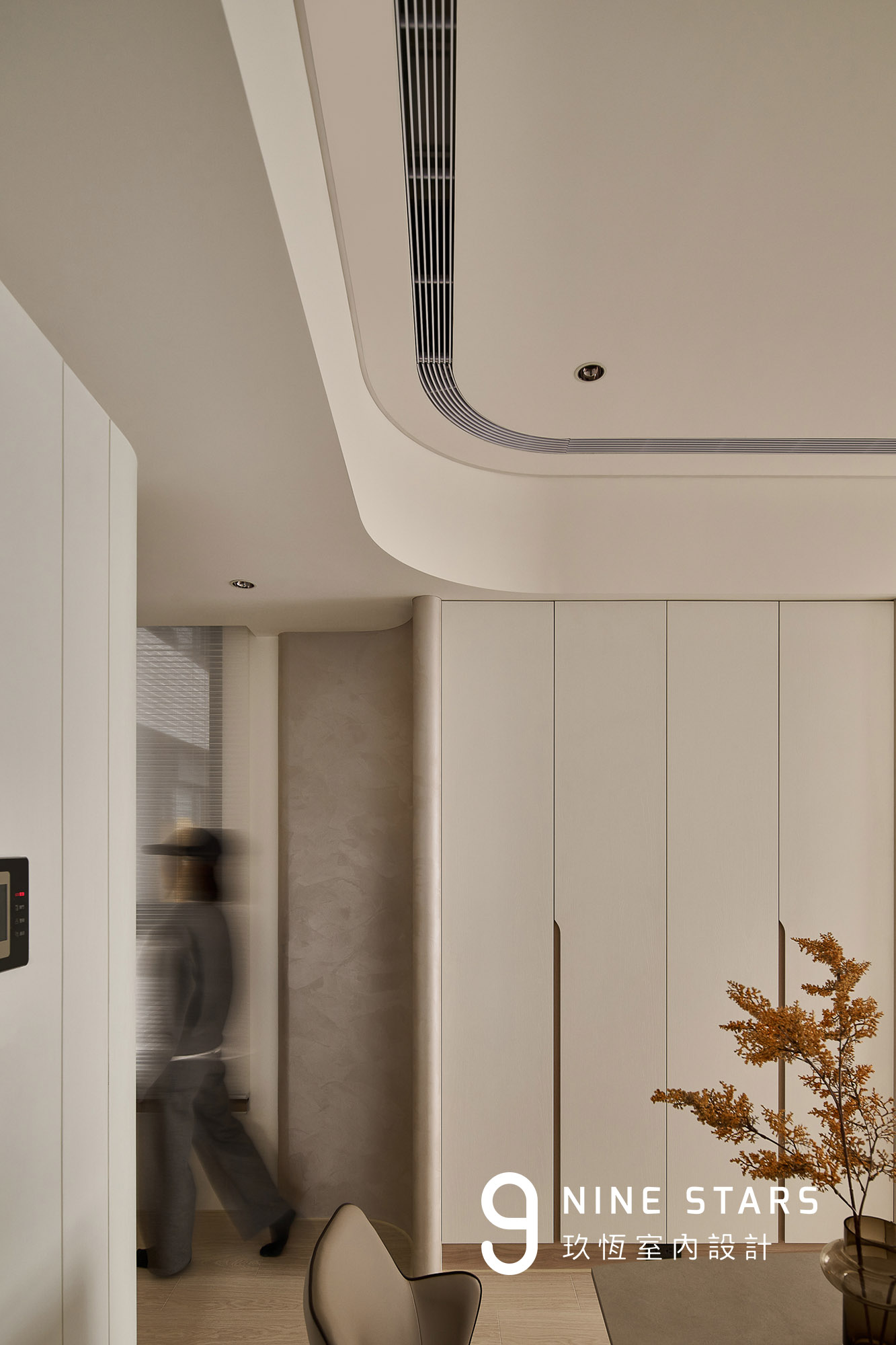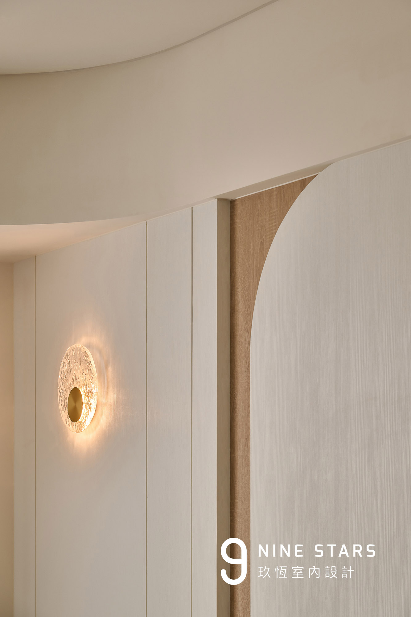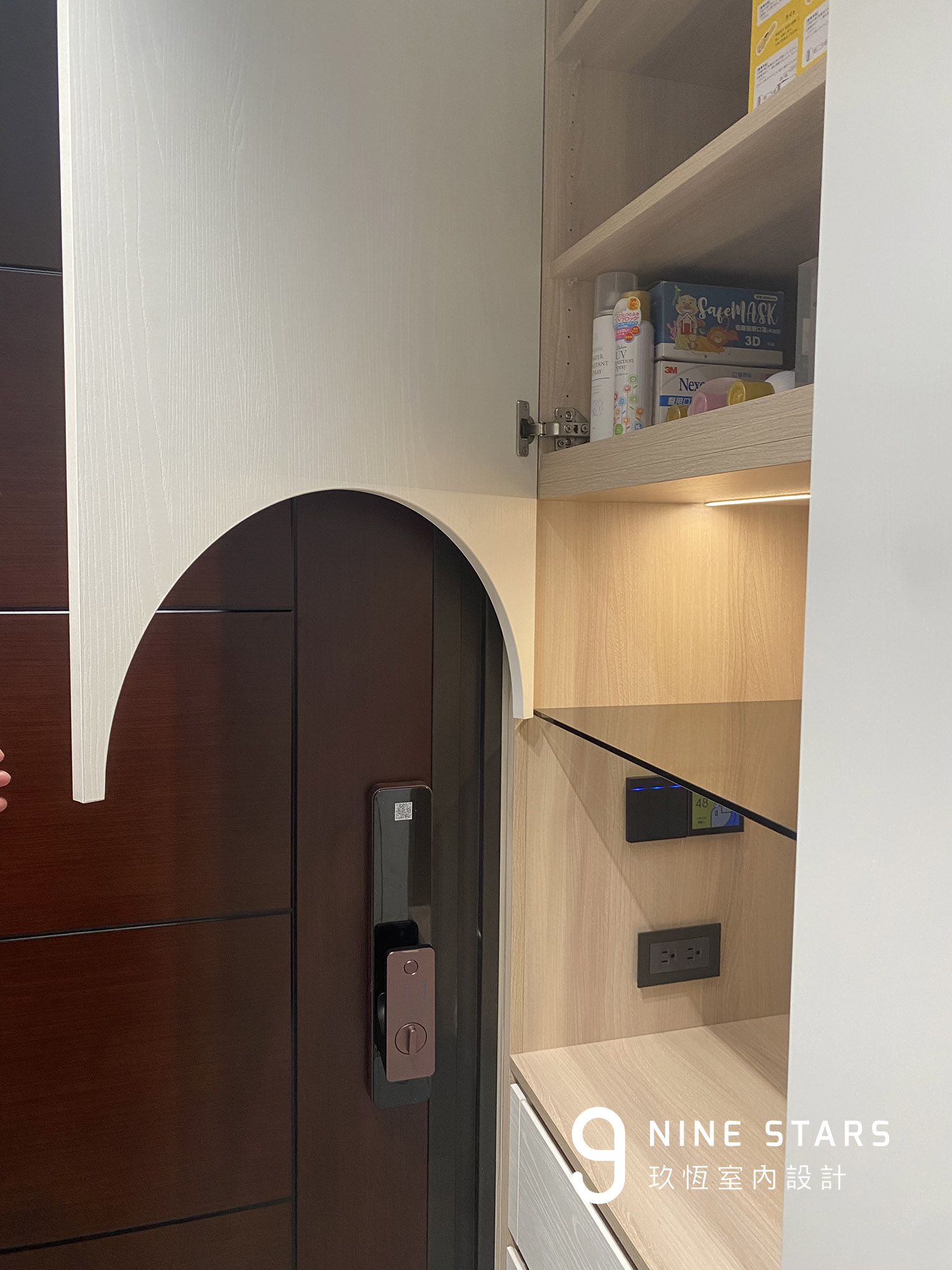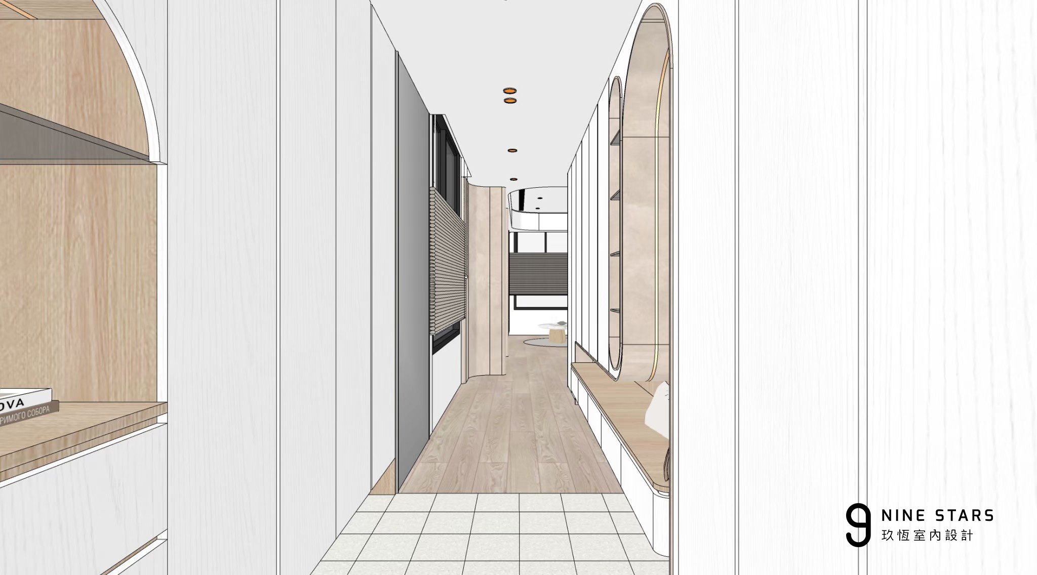 入門視覺以優雅的圓弧造型櫃門揭開序曲,成為全屋弧形設計語彙的起點。櫃內收納鑰匙、備品與日常小物,造型則與斜前方穿鞋椅相互呼應,讓動線與視覺保持柔和連續。