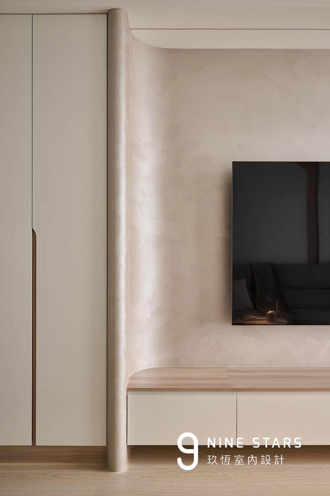 設計師在多處運用進出面(凹凸設計),讓牆面與櫃體不再只是平面存在。客廳收納櫃以大面積 1/2半圓弧作為主視覺,成為公共區域的視覺核心,也柔化了通往客廳的轉折。