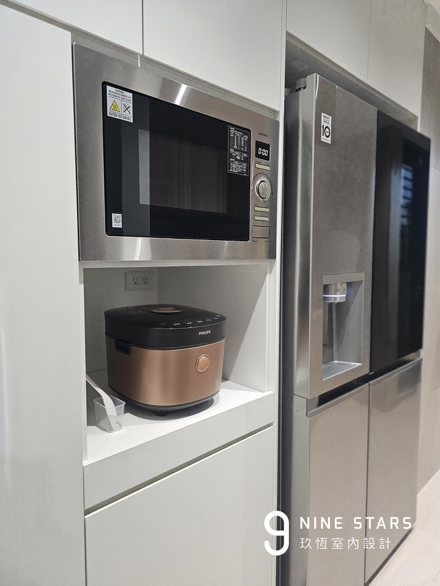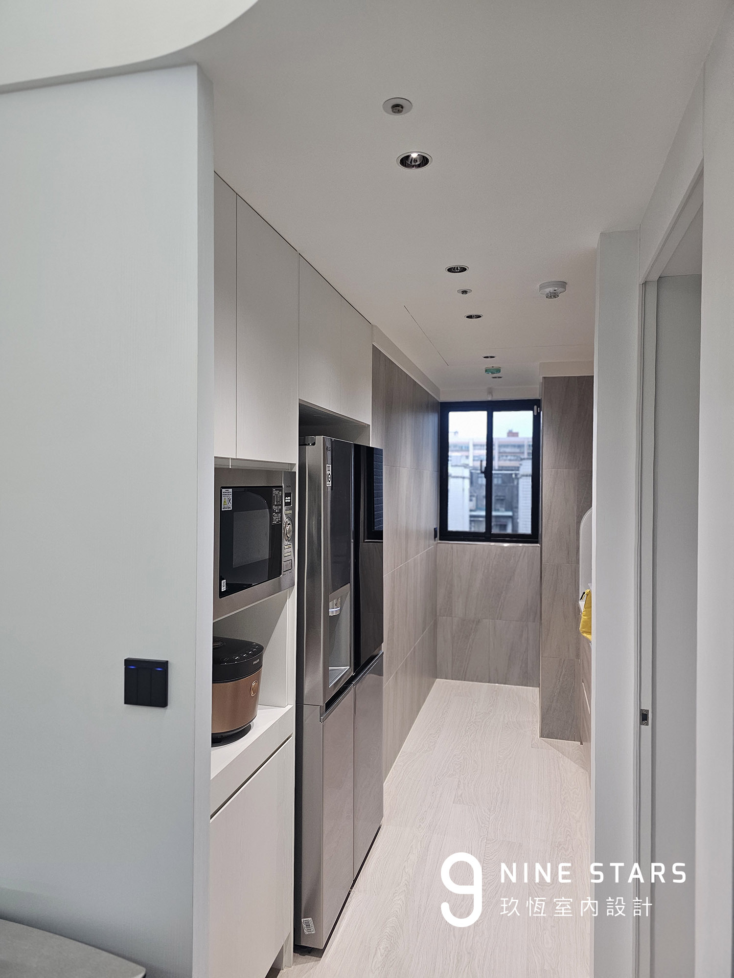 冰箱與電器櫃被完整嵌入牆體,同時為其他空間創造實用收納,坪效被徹底放大。