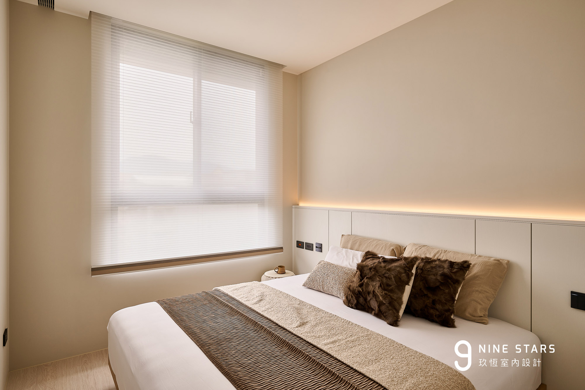 圖|在主臥有限坪數中,以燈光與色系的細膩配置,營造出溫潤而具質感的氛圍。