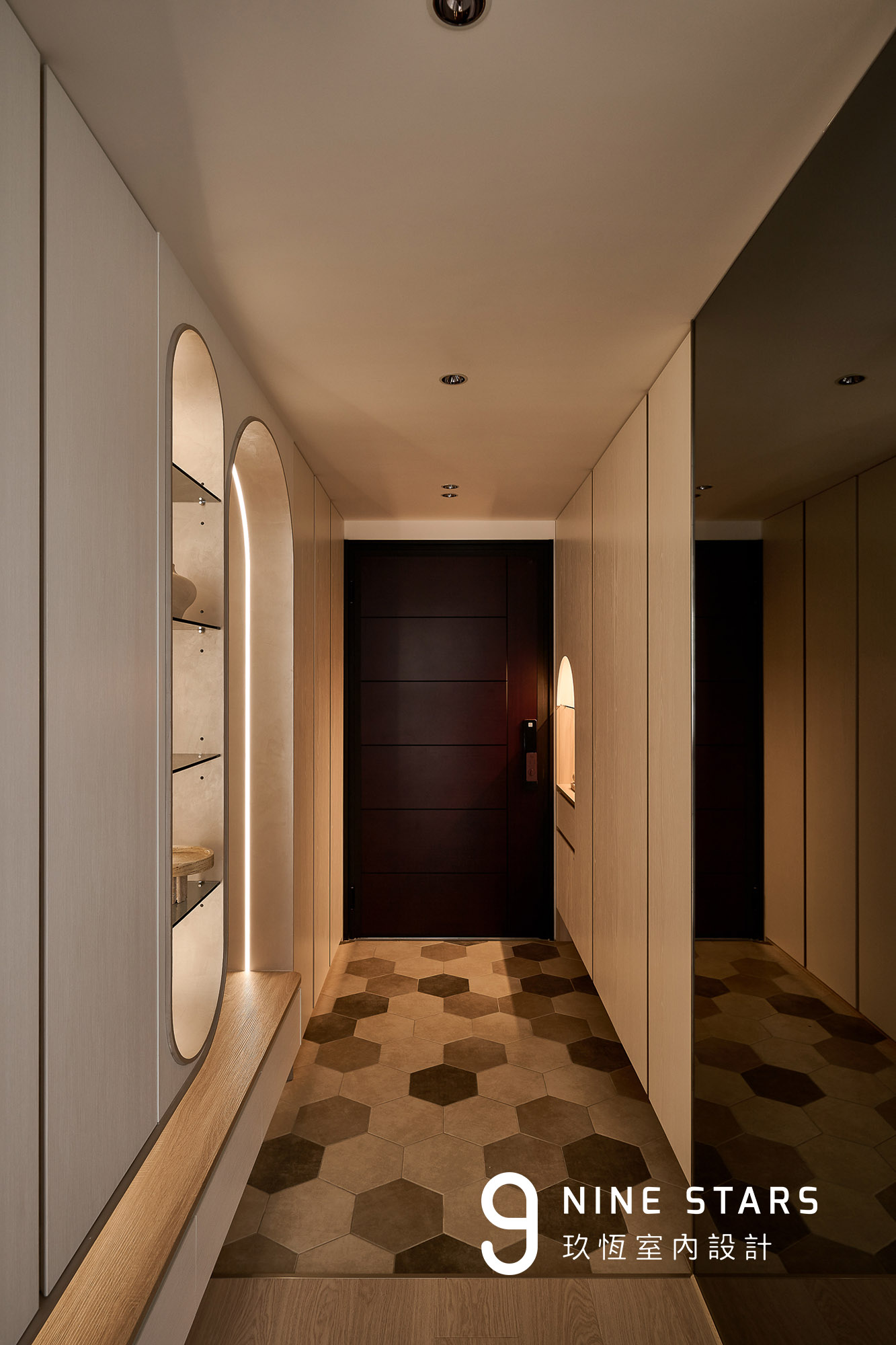 地坪以低彩度六角磚劃分落塵區,界線清楚卻不突兀。考量家中孩子的活動習慣,所有轉角皆採倒弧設計。穿鞋椅特別向外拉出約 5 公分,增加跨距、方便孩子自行穿脫,邊角同步導圓,讓安全成為理所當然的存在。