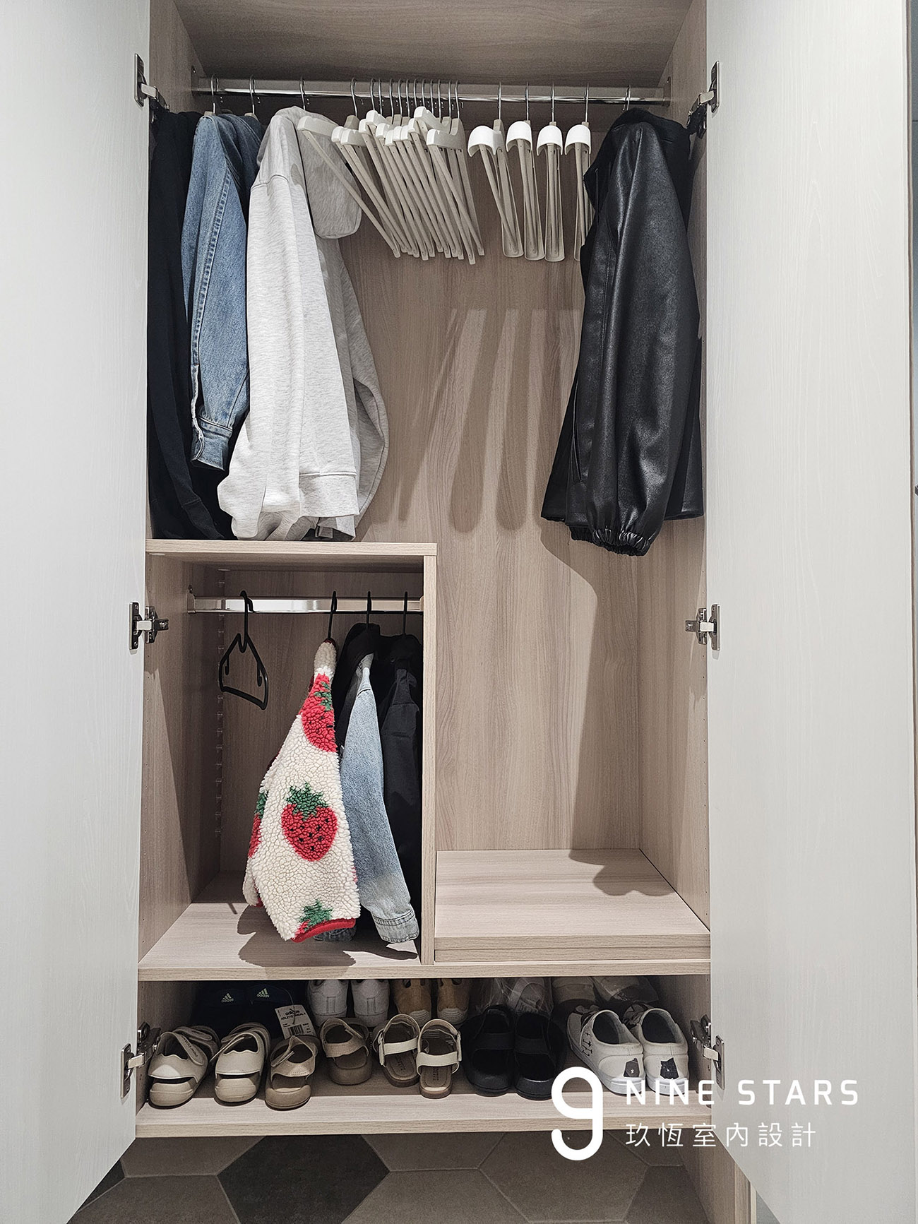 玄關櫃內特別為孩子規劃專屬汙衣櫃,配置可調式層板與小尺寸掛衣桿。當孩子年紀增長,只需重新調整高度、拆卸層板,櫃體便能隨著生活階段自然轉換角色。