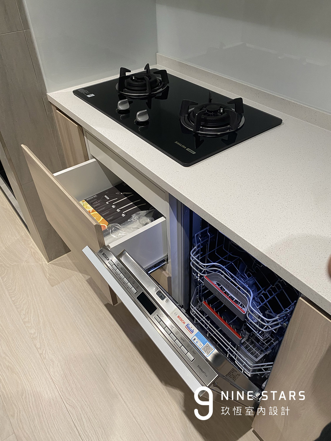 - 靈活調整建商標配,騰出空間安裝了女主人極需的洗碗機,取代建商原始配置規劃(在爐火下方規劃微波爐與電器擺放)。